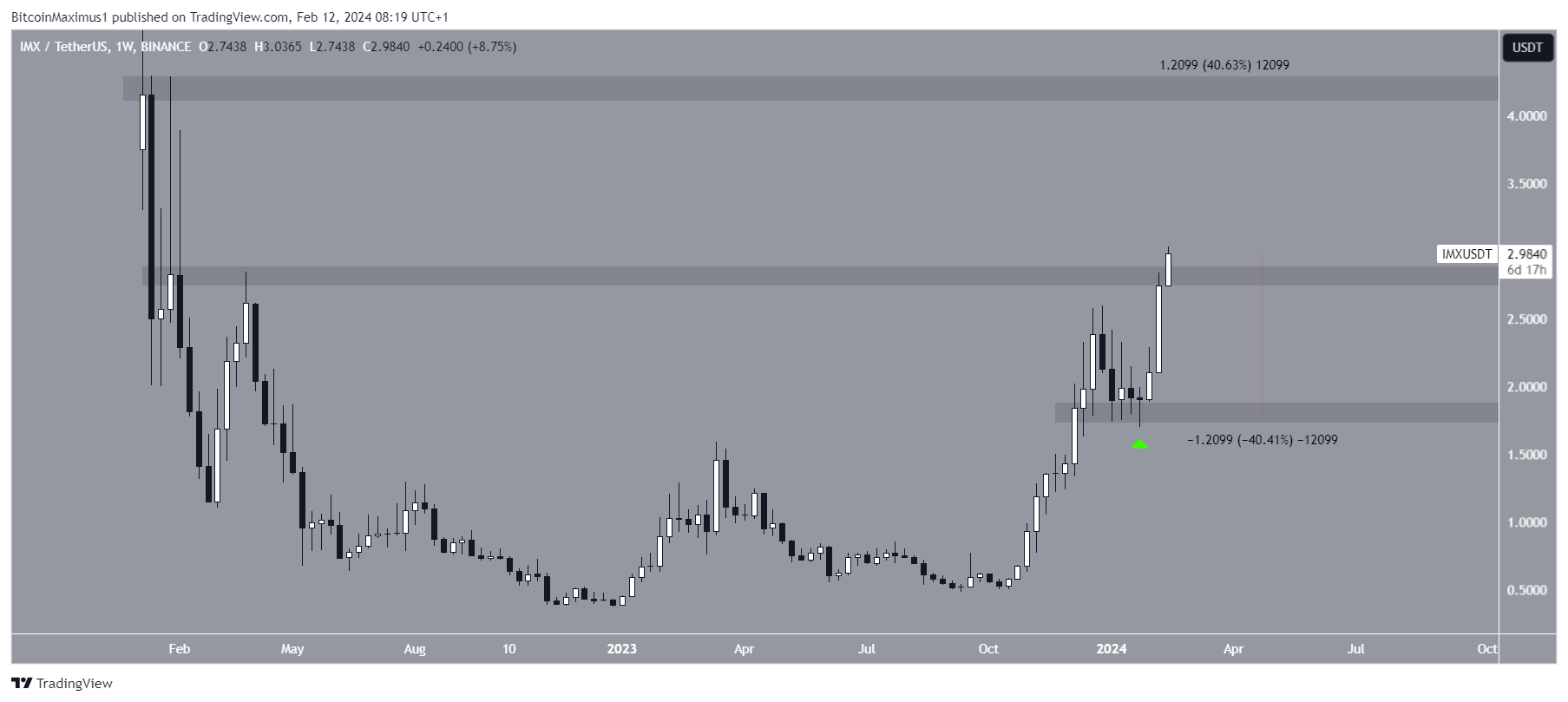 ارتفع سعر IMX بشكل ملحوظ في الأسابيع الثلاثة الماضية بعد الارتداد عند منطقة الدعم الأفقية البالغة 1.80 دولارًا (الرمز الأخضر). أنشأت IMX ثلاث شموع أسبوعية صعودية متتالية.