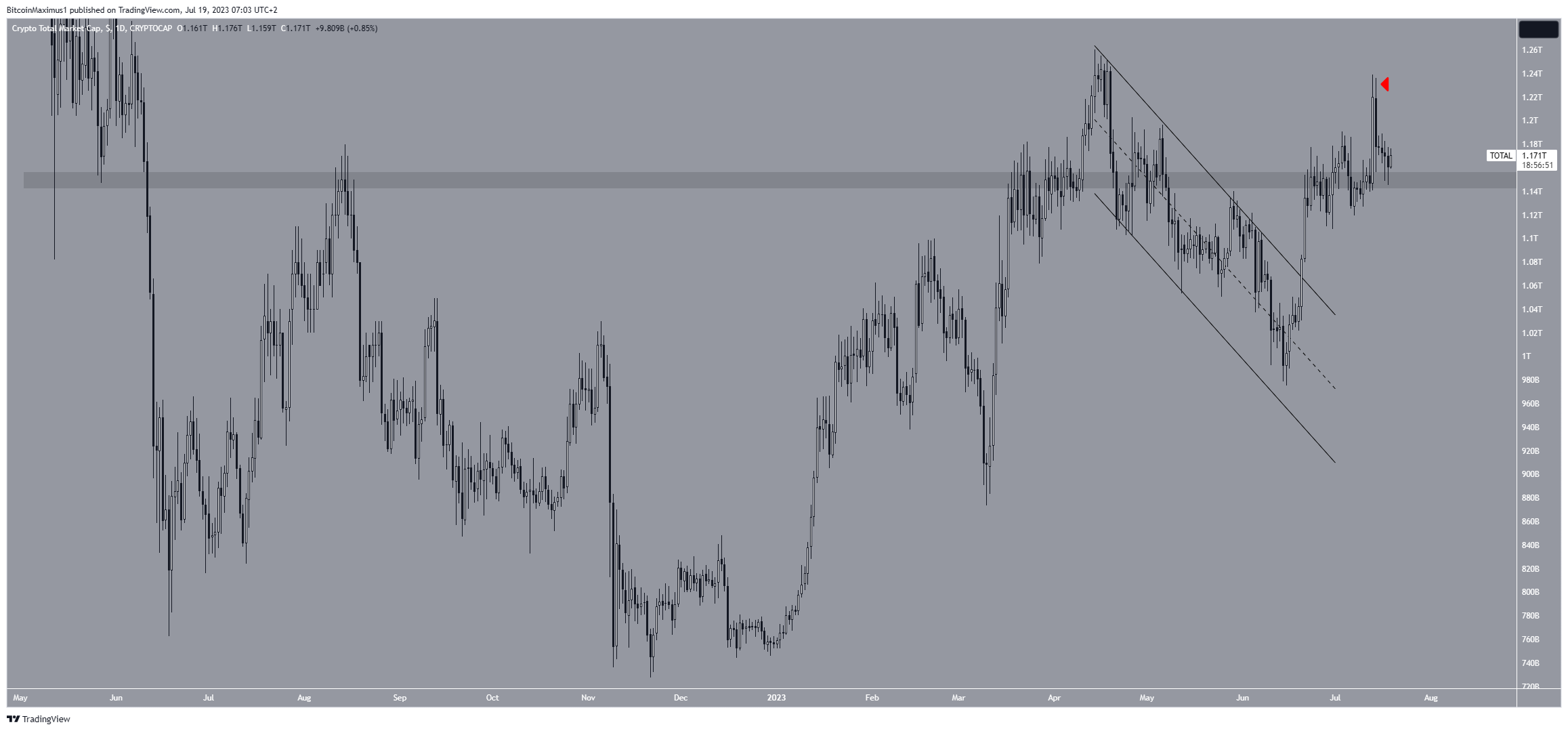 شهدت القيمة السوقية للعملات المشفرة زيادة ملحوظة منذ 15 يونيو. وبحلول 20 يونيو، تحركت خارج القناة الموازية الهابطة. بعد ذلك، تغلبت على منطقة المقاومة البالغة 1.15 تريليون دولار في خلال 10 أيام.