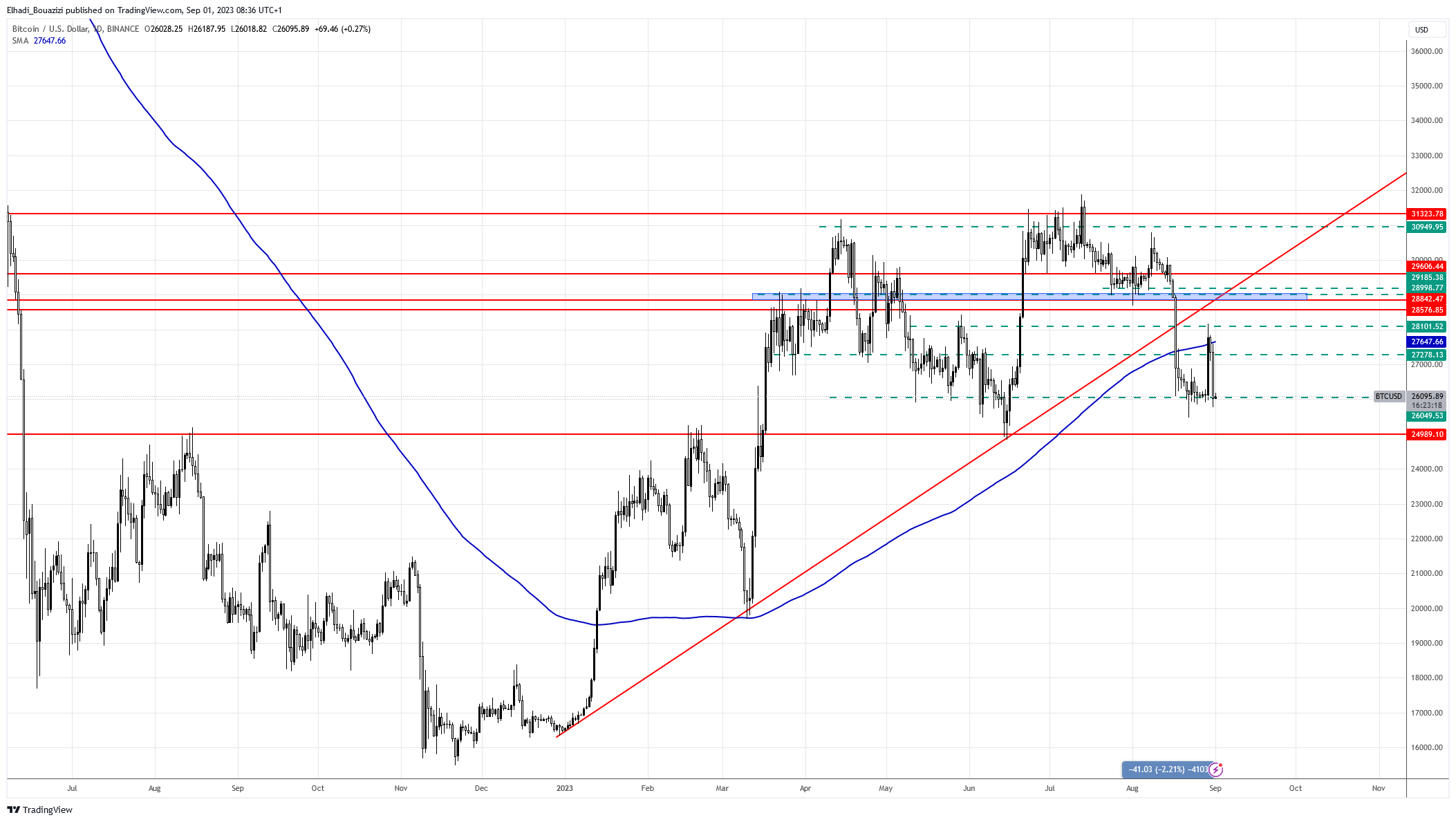 وهذه منطقة مقاومة وموجودة تحت خط الاتجاه الصاعد المكسور ويمكن أن تمتد حتى مستوى 29000 دولار.