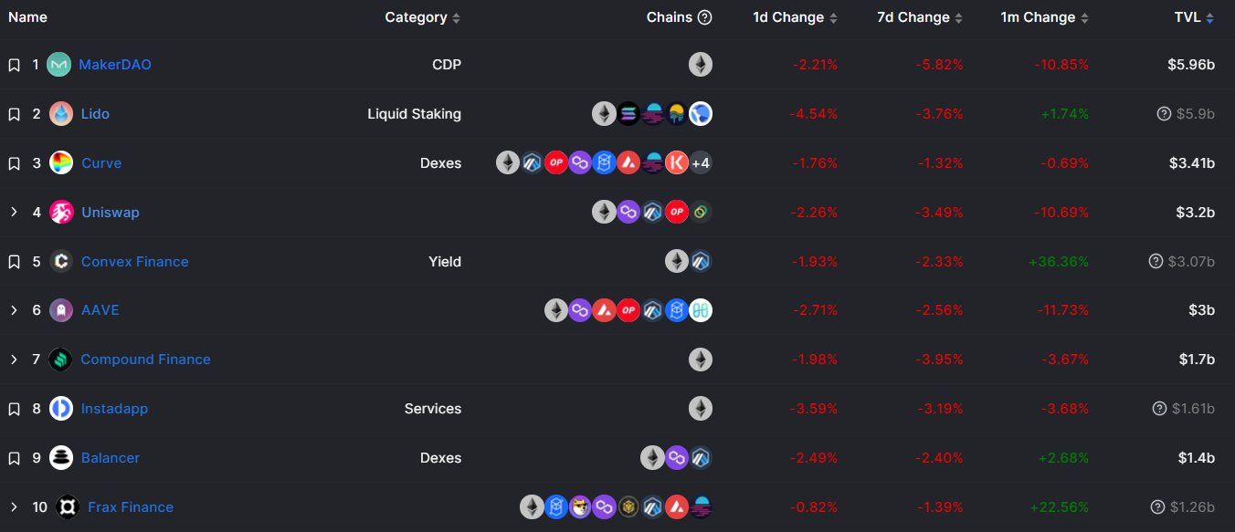 وقد واجهت أفضل عشرة مراكز في بروتوكولات التمويل اللامركزي، انخفاضات مماثلة في القيمة الإجمالية المقفلة، والرسوم على مدار أسبوع، ليكن أشهرها منصتي MakerDao و Uniswap بنسبة 5.82% و3.49%.