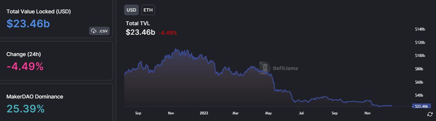 وفي نفس السياق، فإن القيمة الإجمالية المقفلة طريقة لفحص إثبات الحصة على شبكة ايثريوم ETH، حيث وصلت إلى أعلى مستويات سنوية عند 83.9 مليار دولار في 31 مارس، وبعد ذلك بلغت الخسارة نطاق 60 مليار دولار، وفي الخامس عشر من ديسمبر وصلت القيمة المقفلة للشبكة إلى 23.46 مليار دولار.