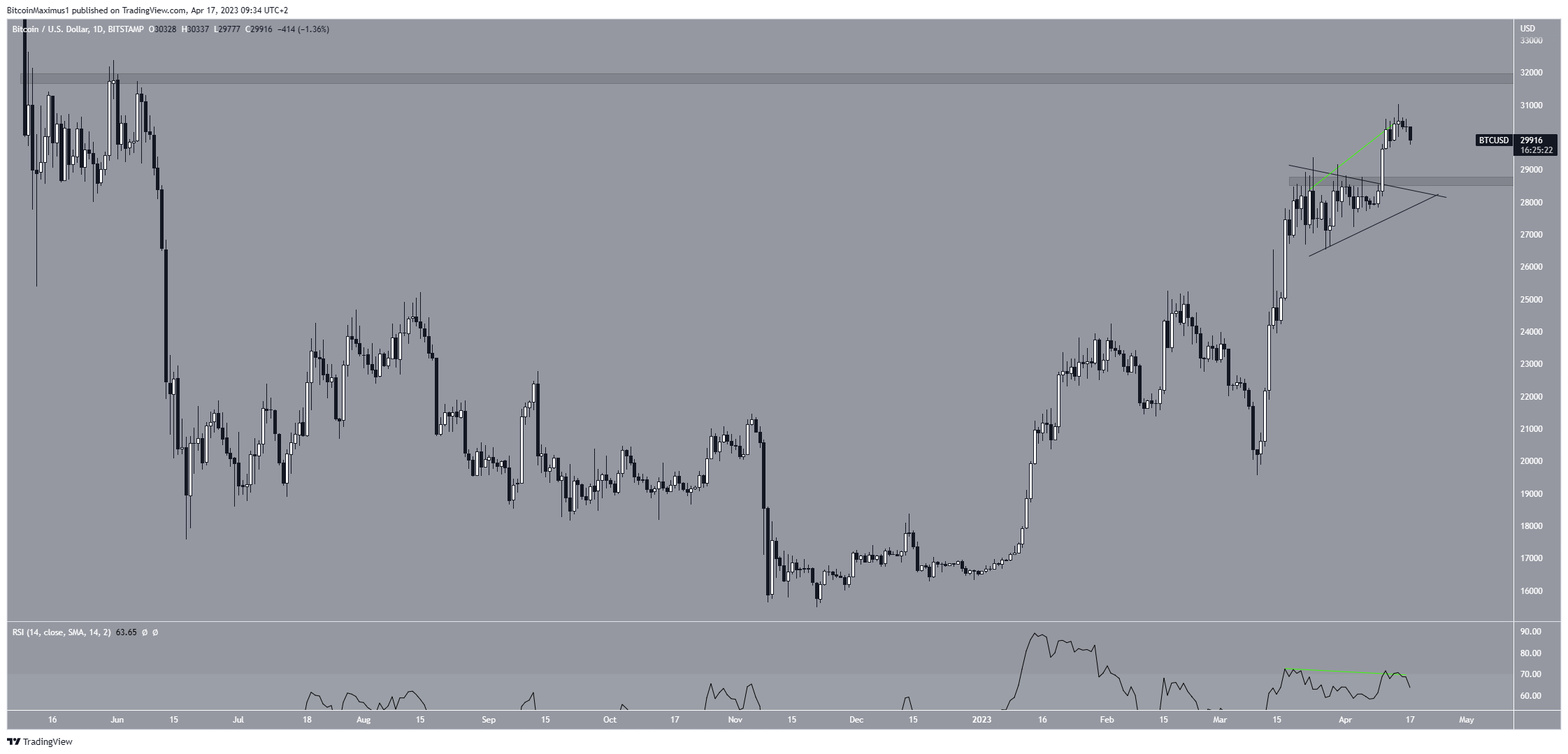 في سياق متصل، انطلق سعر بيتكوين BTC من مثلث متماثل في العاشر من إبريل، ليصل إلى أعلى مستوى سنوي عند 30978 دولار في 14 أبريل.