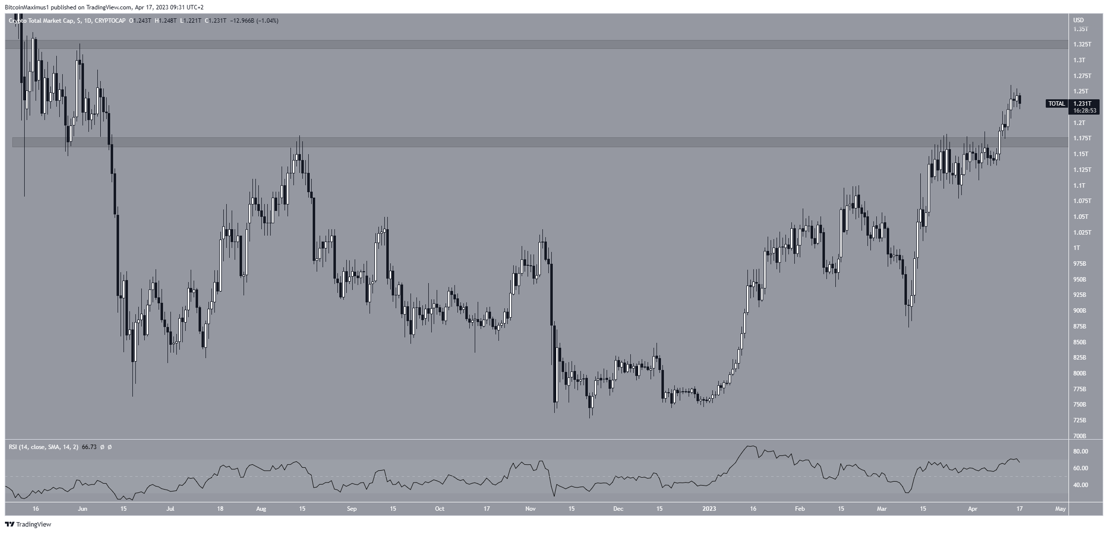 على الجانب الآخر، تجاوزت القيمة السوقية للعملات الرقمية مستوى المقاومة 1.15 تريليون دولار في التاسع من إبريل.