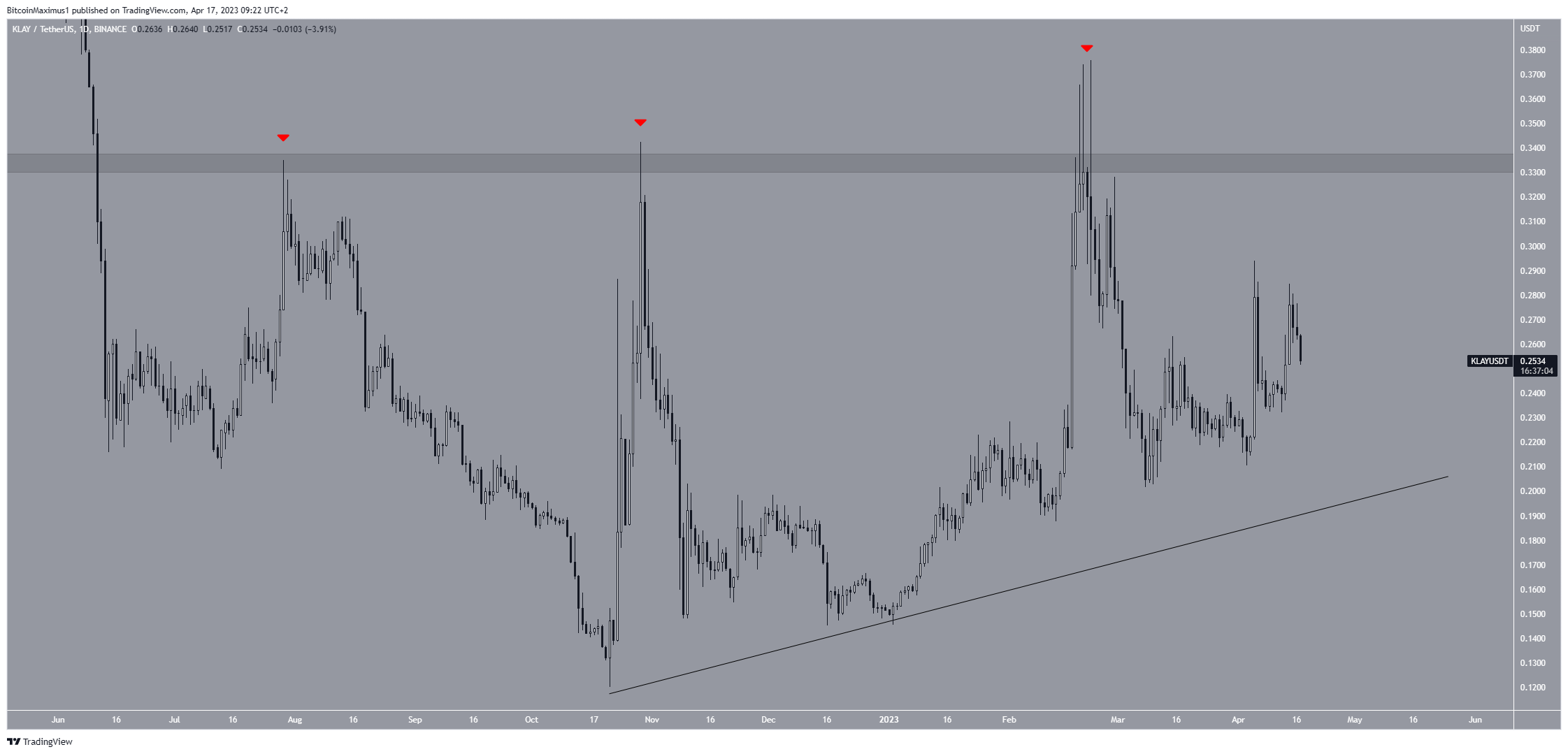في نفس السياق، ارتفع سعر عملة KLAY مع خط دعم تصاعدي منذ أكتوبر 2022.