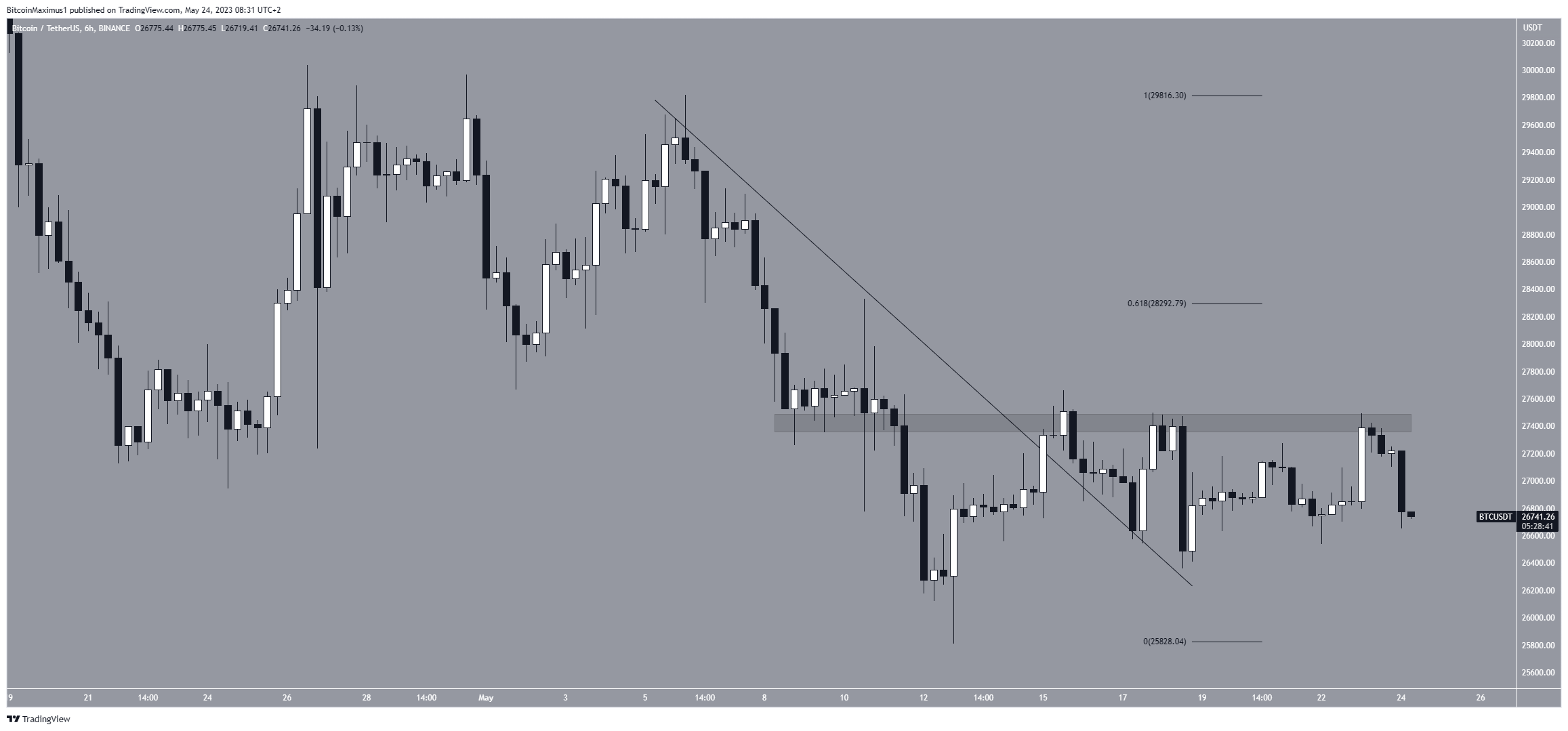 ونتيجة للرفض من منطقة المقاومة 27500 دولار في 23 مايو تسبب ذلك في رفض أخر. ومع استمرار الانخفاض سينخفض سعر بتكوين إلى ما دون منطقة الدعم البالغة 26000 دولار ويمكن أن ينخفض إلى 25000 دولار.