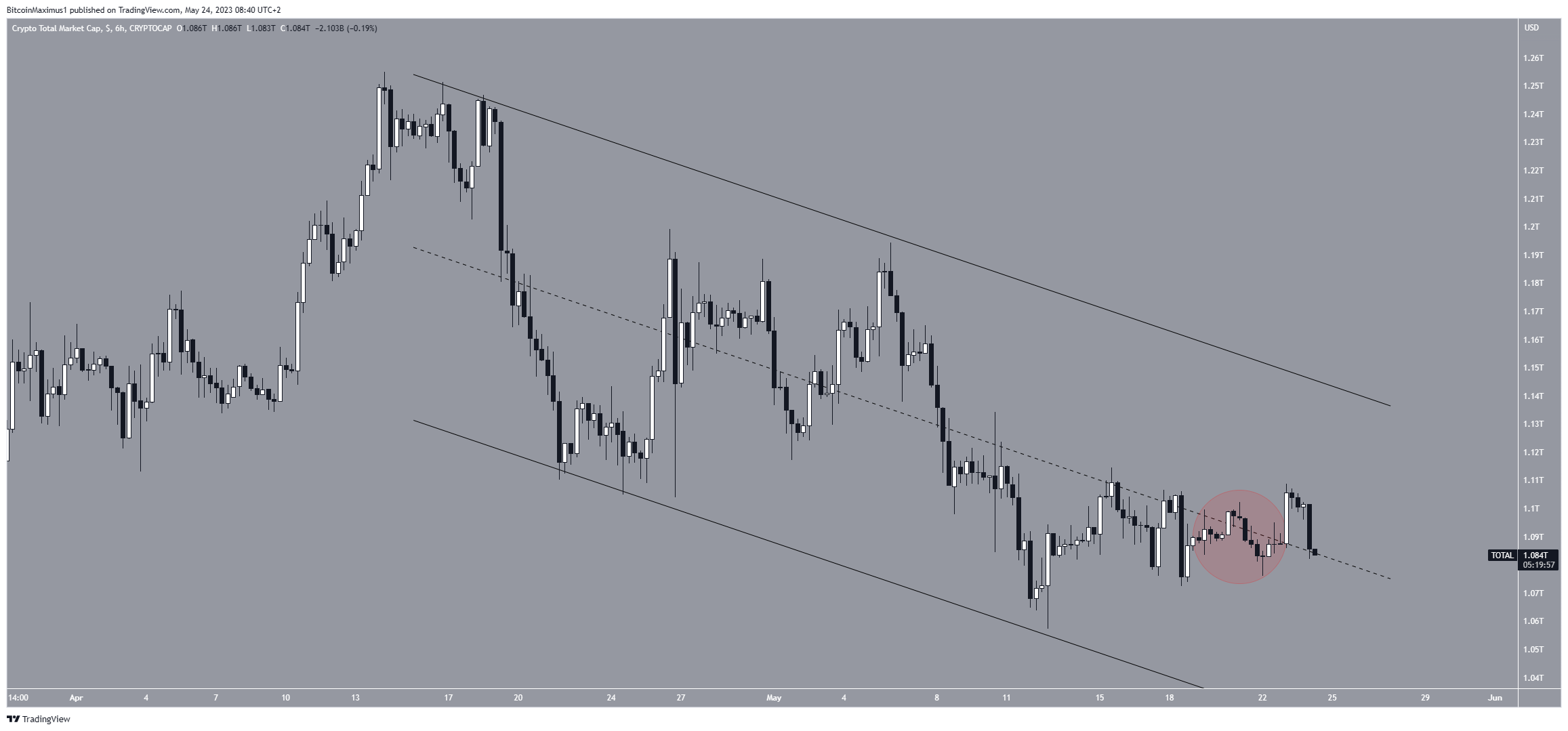 وانخفضت القيمة السوقية داخل قناة موازية هبوطية منذ 17 أبريل، وتُعبر هذه القناة عن نموذج هبوطي. لذا من المتوقع خروج السعر من تلك القناة.