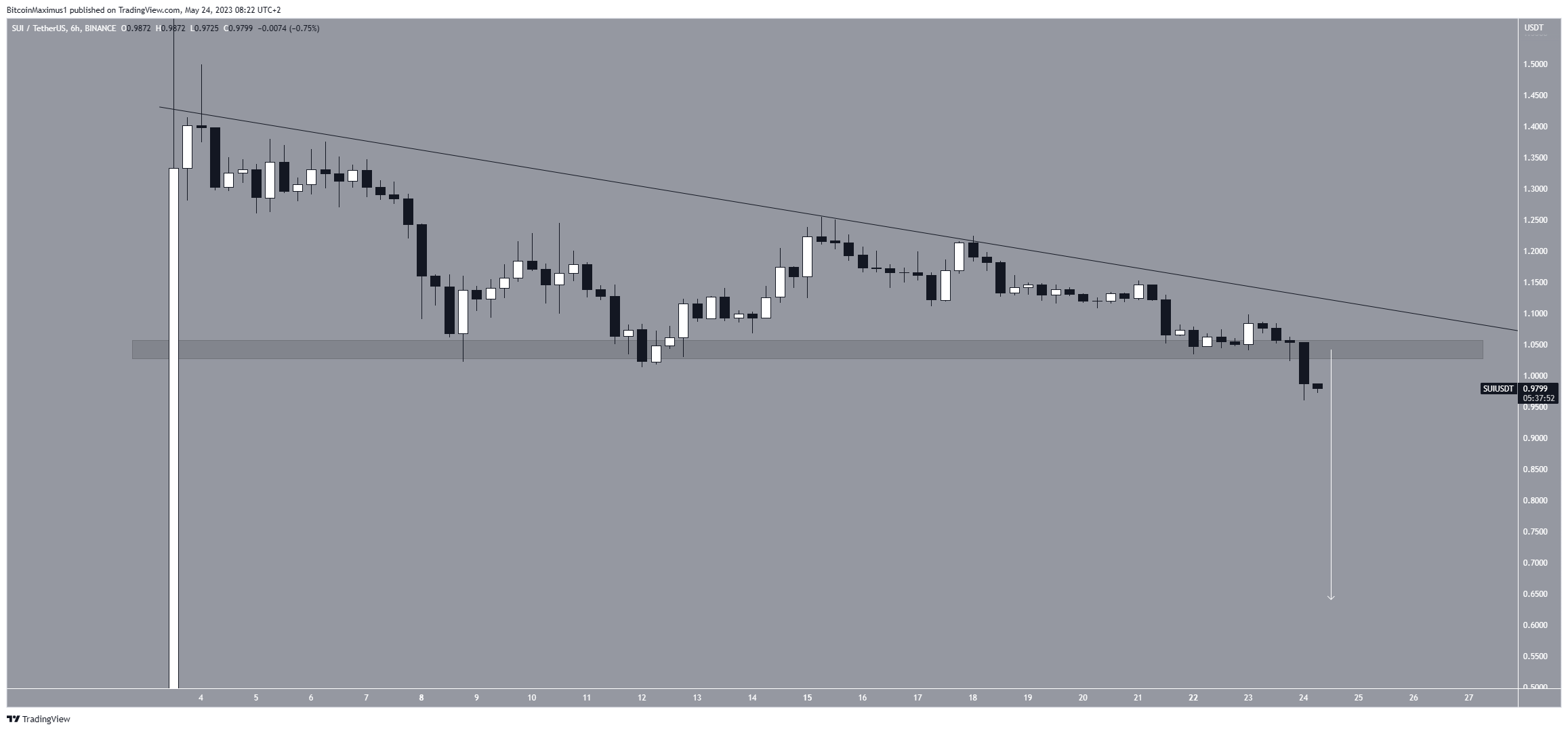 انخفض سعر عملة SUI تحت خط المقاومة التنازلي منذ الثالث من مايو، وبالتزامن مع ذلك ارتد السعر عند منطقة الدعم الأفقية 1.05 دولار لعدة مرات، ثم خلق السعر مثلث هبوطي يُعبر عن اتجاه هبوطي.