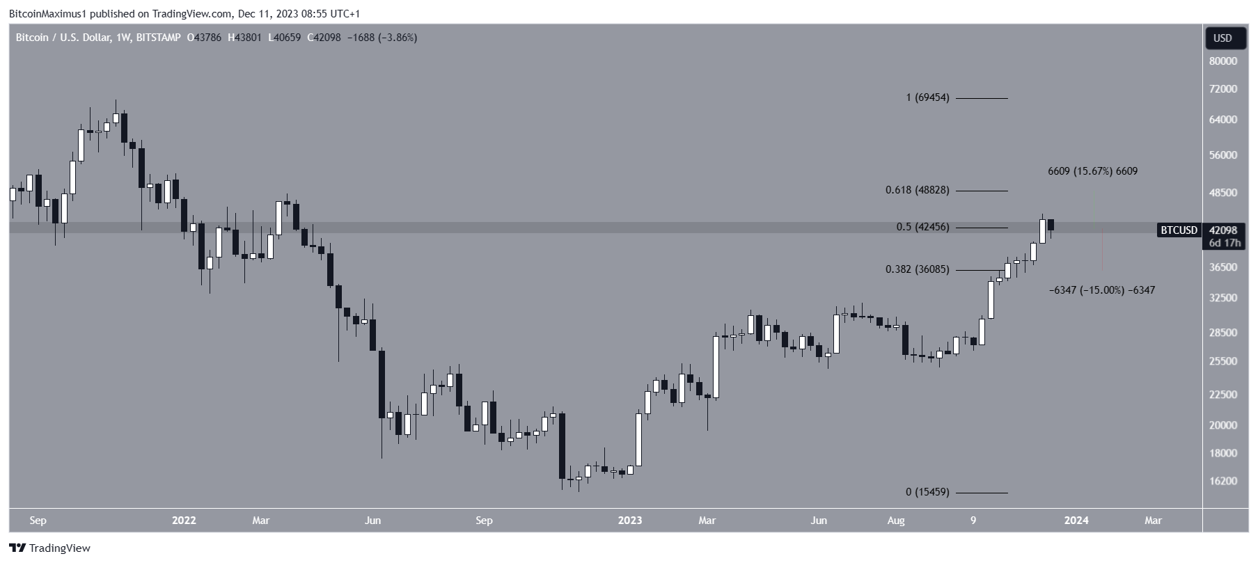 من ناحية أخرى، يمكن أن يؤدي الإغلاق تحت مستوى 42,450 دولارًا إلى انخفاض بنسبة 15% إلى أقرب دعم عند 36,000 دولار.
