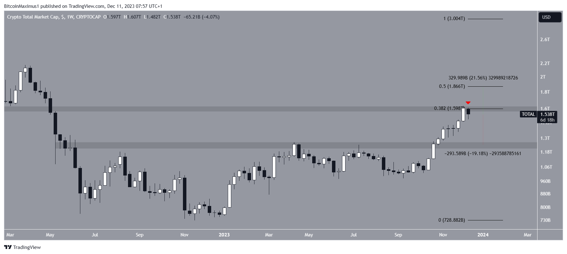 ارتفعت القيمة السوقية بسرعة منذ أكتوبر، مما أدى إلى تكوين ثمانية شموع أسبوعية صعودية متتالية. وبلغت الحركة الصعودية ذروتها مع ارتفاع سنوي جديد بلغ 1.63 تريليون دولار الأسبوع الماضي.