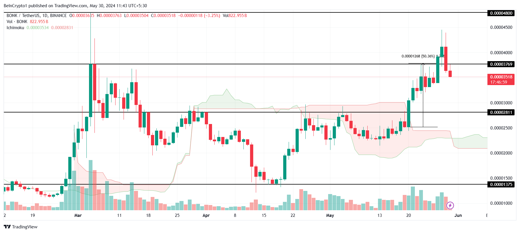 سجل سعر BONK أعلى مستوى جديد له على الإطلاق هذا الأسبوع بعد أن سجل ارتفاعا إلى 0.00004000 دولار. ولكن بعد الإنجاز مباشرة ، انخفضت عملة الميم بنسبة 15٪ تقريبا في آخر 24 ساعة ، مما أدى إلى إرسال BONK إلى 0.00003518 دولار.
