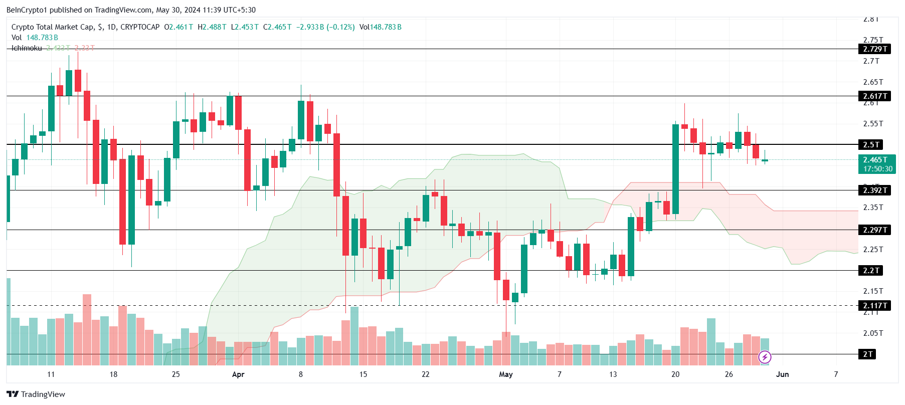 الدعم الحاسم التالي هو 2.39 تريليون دولار. التراجع إلى هذه النقطة يعني انخفاضا بنسبة 2.5٪، وهو أمر ممكن. وذلك لأن سحابة إيشيموكو تظهر هبوطا على الرغم من كونها أقل من الشموع.