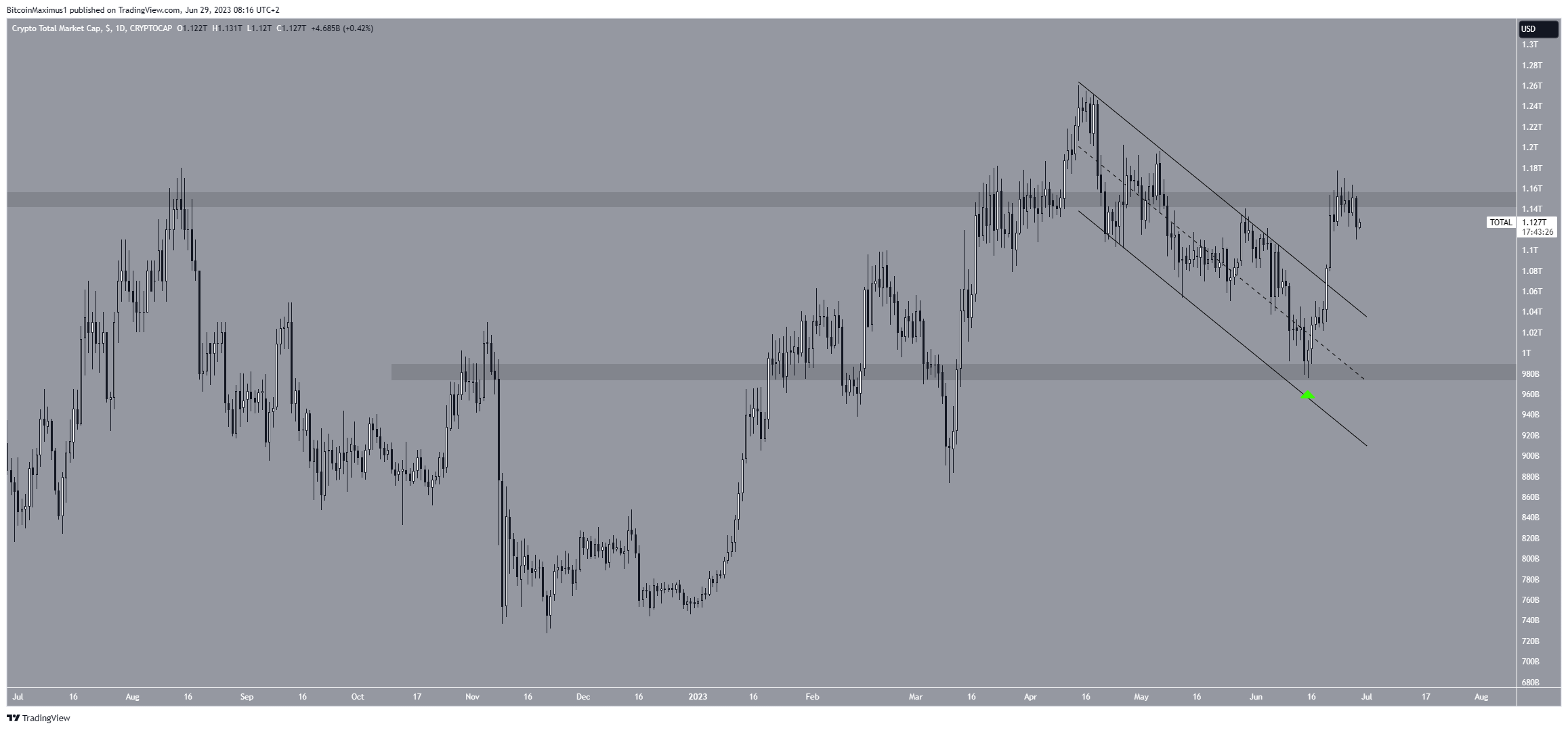 في نفس السياق ففي 15 يونيو، شهدت القيمة السوقية للعملات المشفرة انتعاشًا كبيرًا، مما أكد أن المستوى 980 مليار دولار كدعم محلاً للثقة. وبعد خمسة أيام، تجاوزت القناة الموازية الهابطة، لتصل قيمتها عند 1.17 تريليون دولار في 23 يونيو.