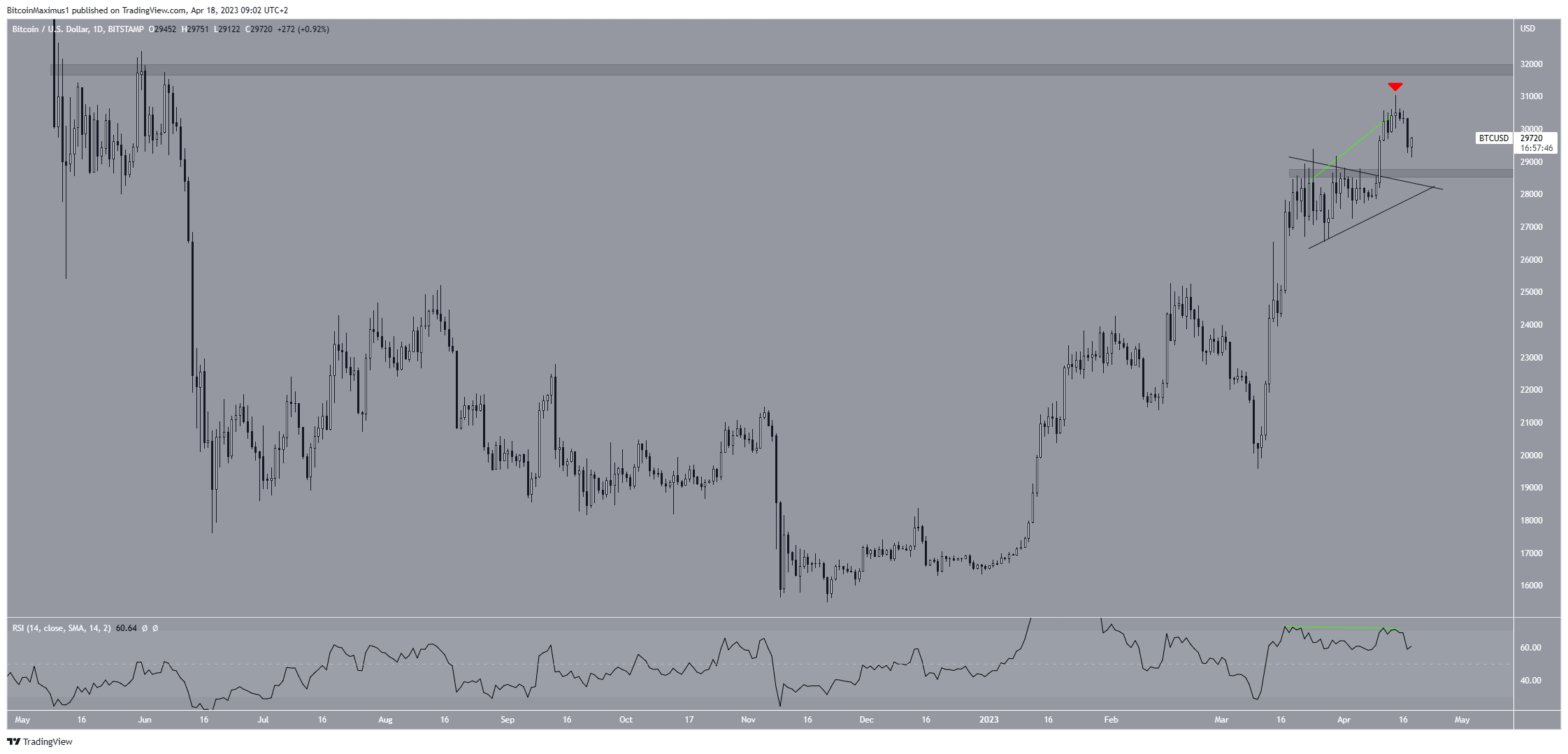 ووصل سعر العملة الرقمية إلى أعلى مستوى سنوي جديد عند 30978 دولار في الرابع عشر من إبريل.
