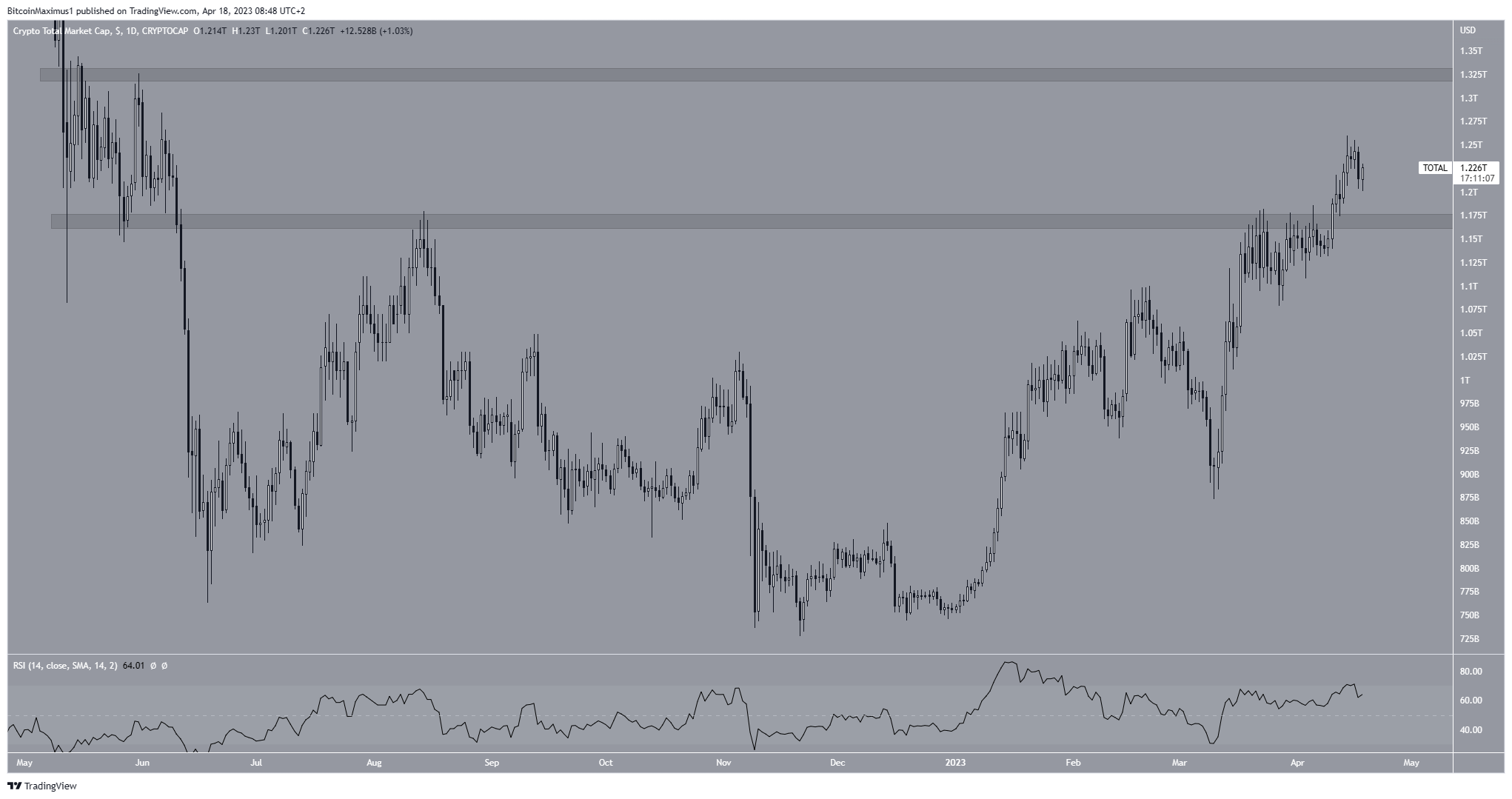 أسست القيمة السوقية الإجمالية الخاصة بالعملات الرقمية شمعة هبوطية في السابع عشر من أبريل.