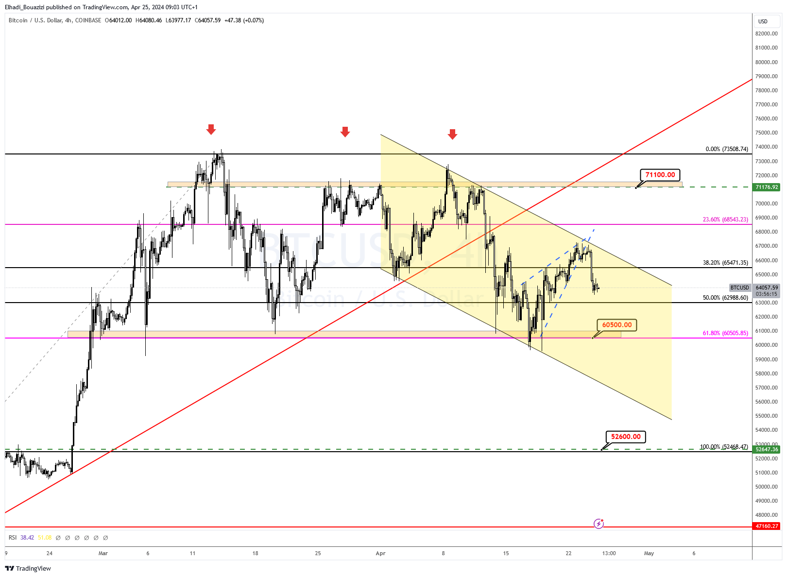 في تحليلات سابقة ذكرنا بداية تشكل قناة سعرية هابطة على الرسم البياني لسعر البيتكوين BTC. التي من المرجع أن تقف حاجزا أمام الارتفاع وتخطي مستوى 66,500 – 67,000 دولار.