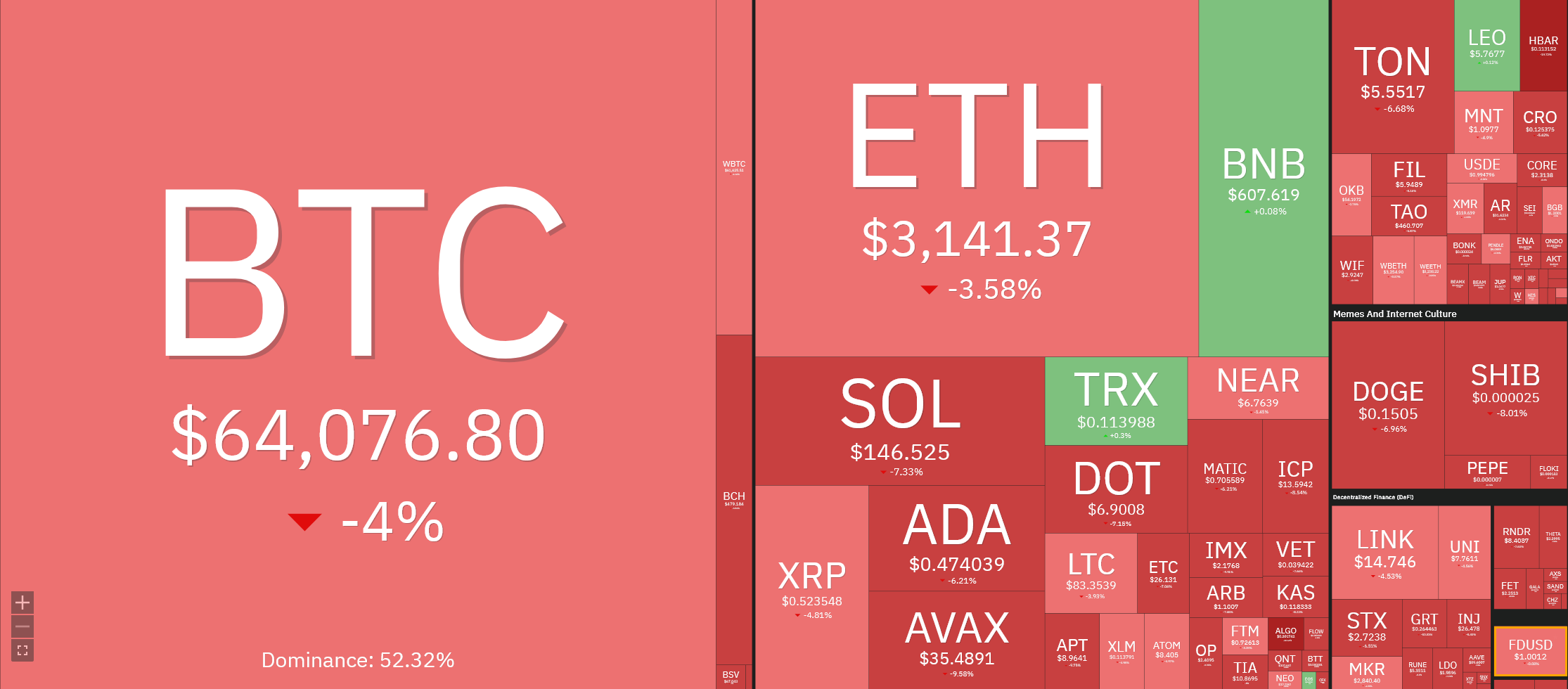 انخفض سعر البيتكوين بنسبة 4.6% خلال بضع ساعات من إعلان وزارة العدل، ليصل إلى حدود 63,500 دولار . ليس بيتكوين وحدها و إنما كامل سوق العملات الرقمية الذي تلوّن بالأحمر.