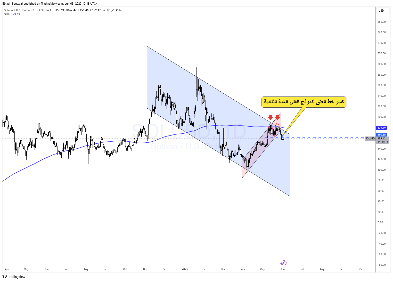 يُظهر الرسم البياني اليومي لسعر علمة سولانا SOL فشلًا واضحًا في محاولة اختراق الحد العلوي للقناة السعرية الهابطة الممتدة منذ نهاية عام 2023، حيث توقّف السعر عند مستوى 180 دولار ثم انعكس هبوطًا.
