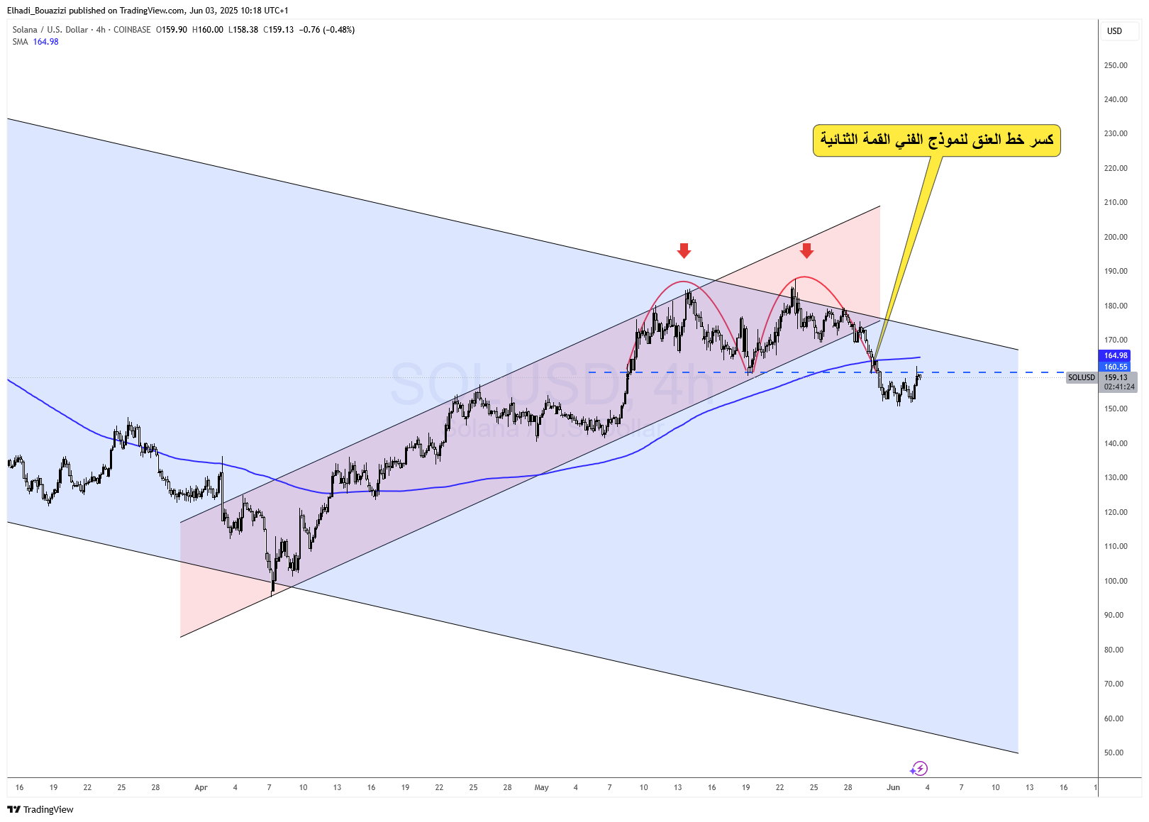 ويتقاطع هذا التراجع مع ظهور نموذج فني انعكاسي على الإطار الزمني 4 ساعات، هو نموذج القمة الثنائية، الذي تم تأكيده بكسر واضح لخط العنق عند مستوى 164 دولار، تلاه إعادة اختبار فاشلة.