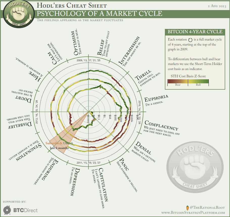 ثم نشر المحلل أيضًا نسخة مختلفة قليلاً من مخططه، حيث يقوم بتعيين مراحل متتالية من دورات البتكوين التي تبلغ 4 سنوات لمراحل نفسية المستثمر. ويعبر هذا عن المشاعر السائدة التي تحيط بالمشاركين في السوق في كل مرحلة من مراحل الدورة.