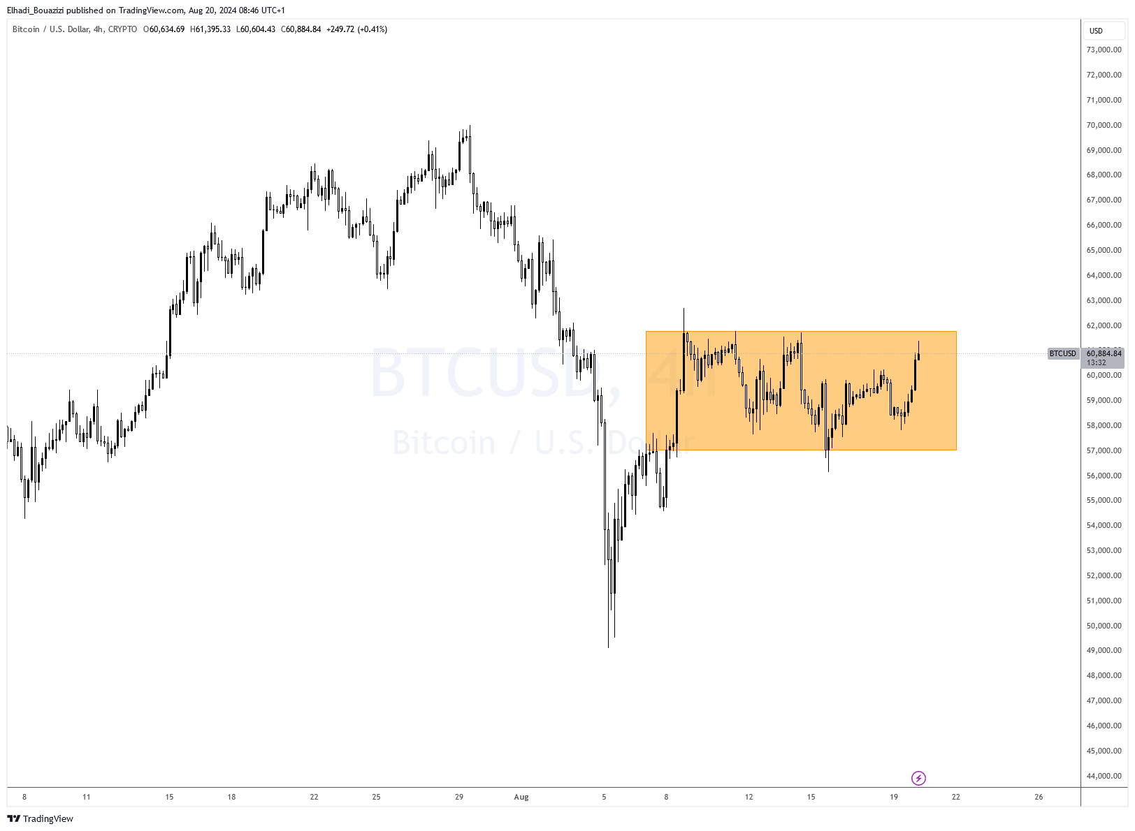 • سعر البيتكوين يتحرك بشكل جانبي بين 57,000 و 62,000 دولار، نتيجة الترقب الاقتصادي والمخاوف من الركود.