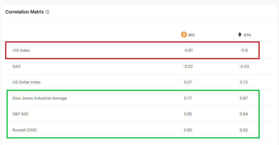 ويعزز هذا الاتجاه مؤشر "VIX" المعروف بمؤشر الخوف، والذي يظهر ارتباطاً عكسياً حاداً مع البيتكوين، فكلما ارتفع المؤشر، تراجعت قيمة العملة الرقمية.