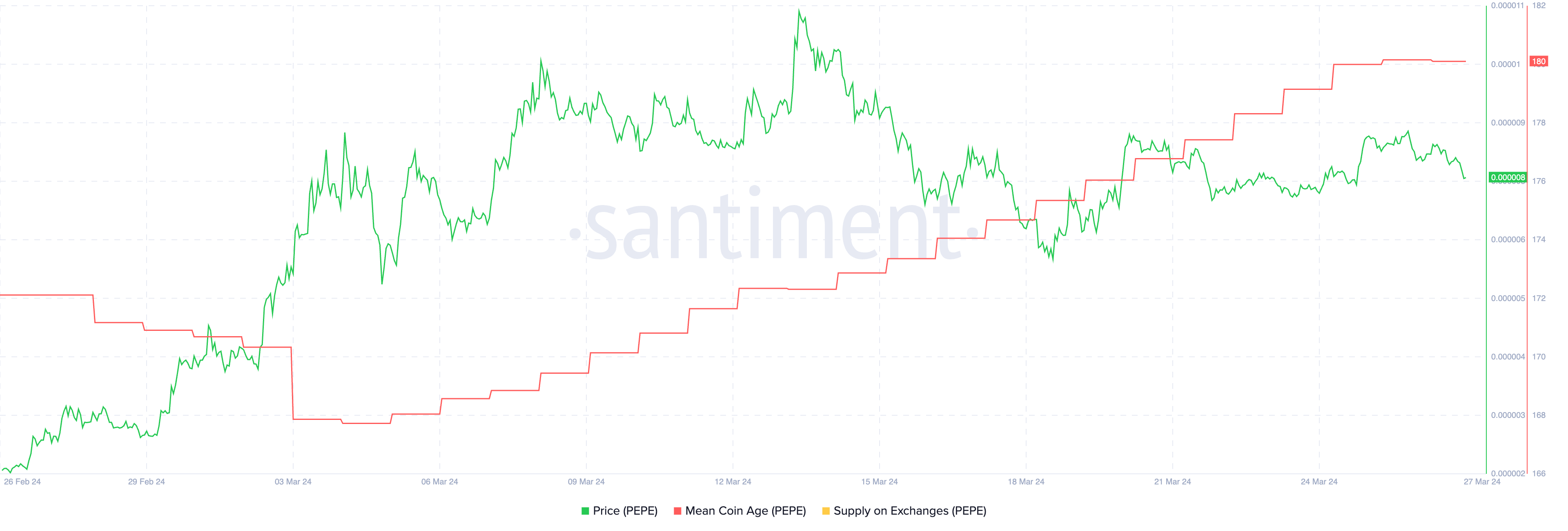 شهد المعروض من PEPE في البورصات انخفاضًا كبيرًا في يوم واحد فقط، مما يشير إلى أن حاملي العملة يتوقعون ارتفاعًا في القيمة، حيث يشير متوسط عمر العملة المتزايد إلى نقص ضغوط البيع ومرحلة من التراكم.