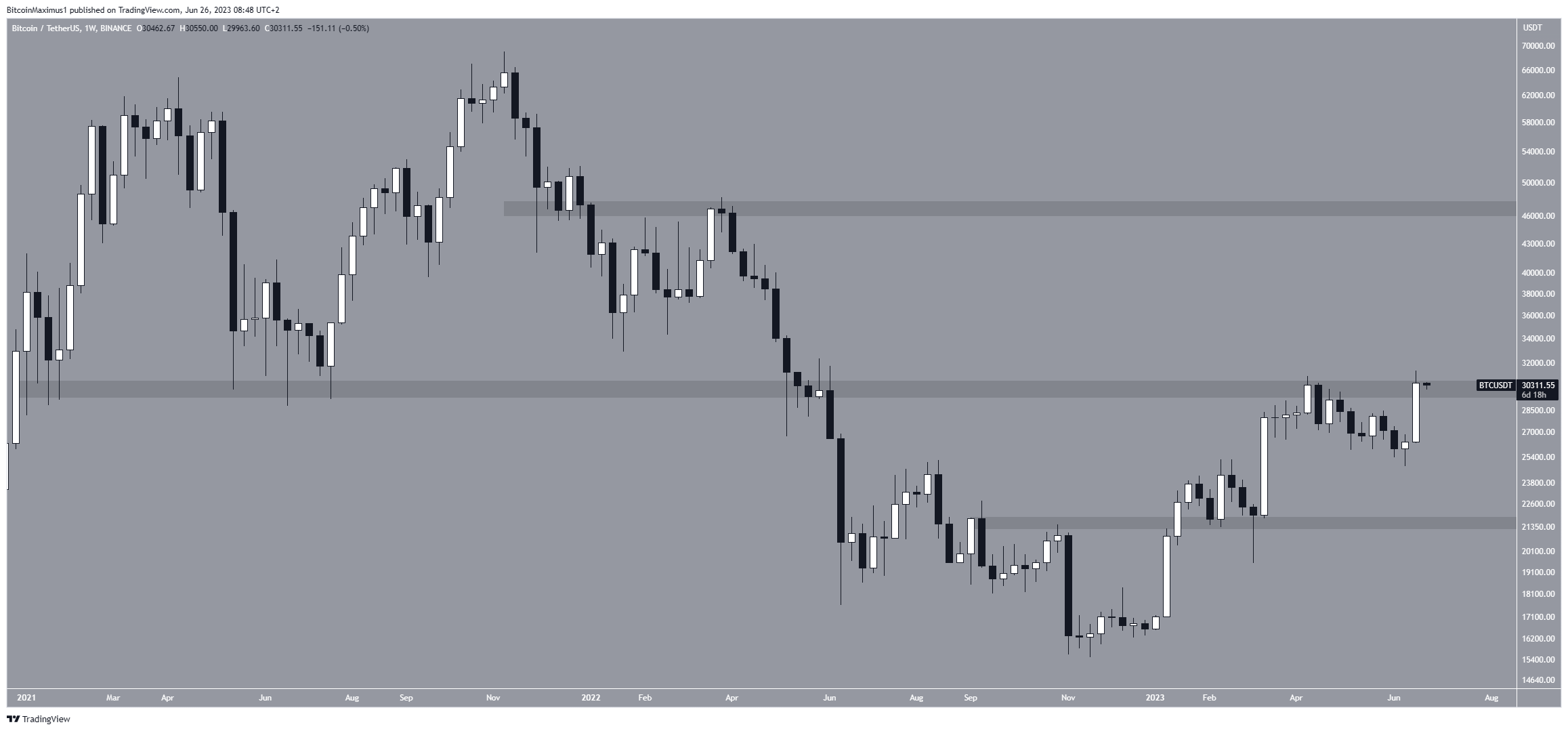 وخلال الأسبوع الماضي، أنشأ سعر البيتكوين شمعة تصاعدية كبيرة في الإطار الزمني الأسبوعي. وأدى هذا إلى ارتفاع سنوي جديد قدره 31.431 دولار. كما انخفض البتكوين بشكل طفيف بعد ذلك ليتم تداوله الآن داخل منطقة المقاومة طويلة الأجل التي تبلغ 30.000 دولار.