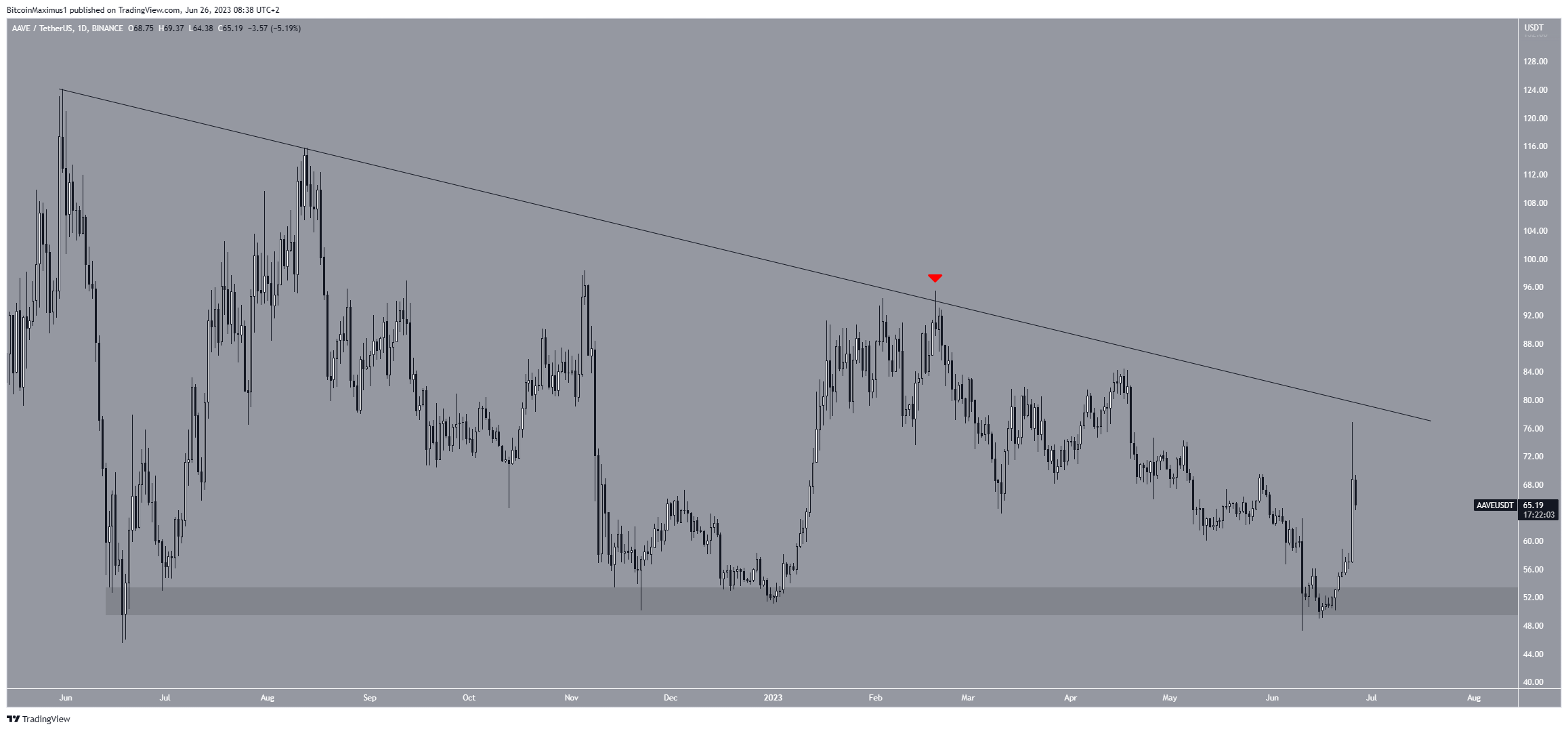 على الجانب الآخر انخفض سعر AAVE تحت خط المقاومة التنازلي منذ بداية يونيو. وتم التحقق من صحة الخط عدة مرات، كان آخرها في 16 فبراير (رمز أحمر). كما أدى هذا الانخفاض إلى أدنى مستوى سنوي جديد عند 47.30 دولار في 10 يونيو.