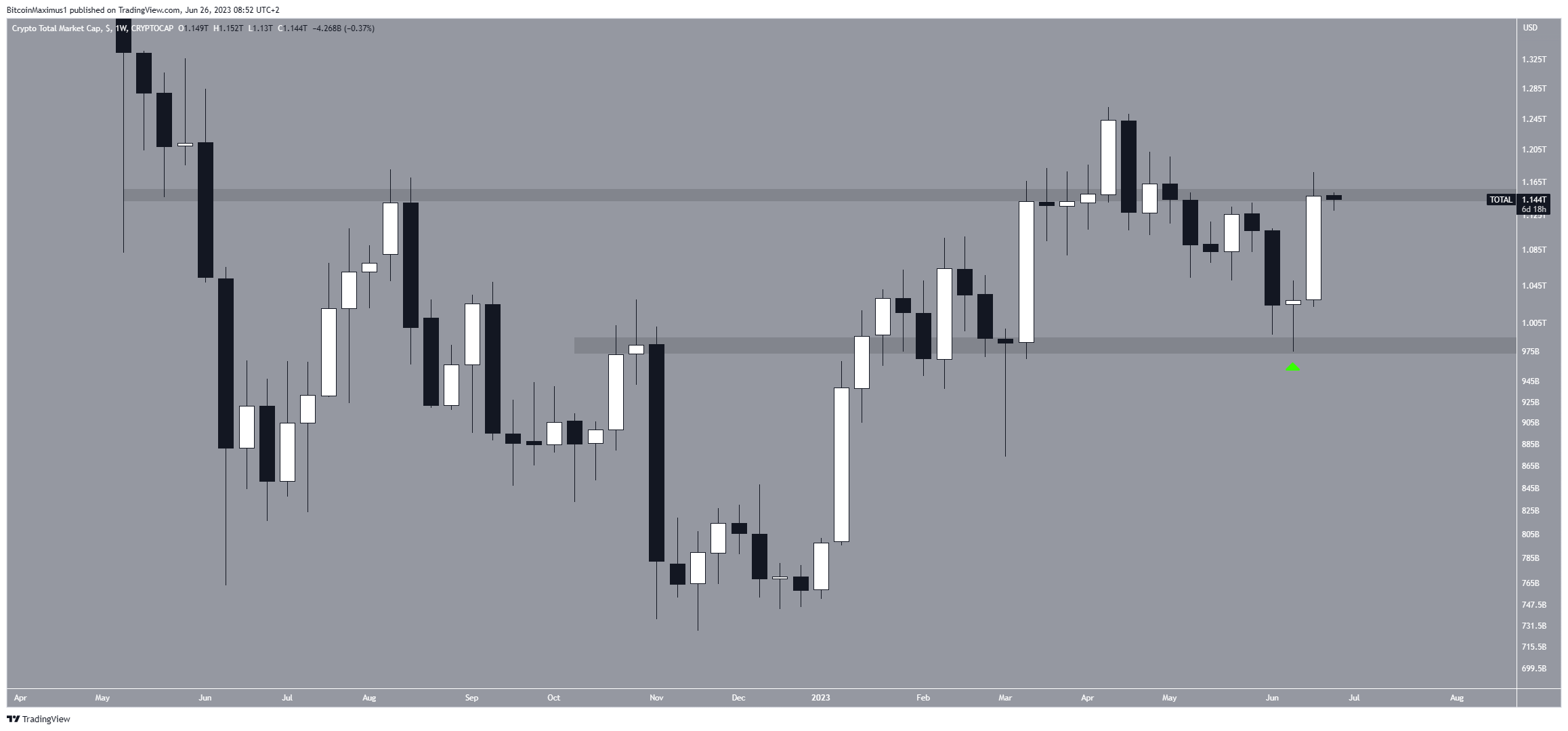 ارتفعت القيمة السوقية للعملات الرقمية بشكل كبير الأسبوع الماضي بعد ارتداده عند منطقة الدعم البالغة 970 مليار دولار (الرمز الأخضر). وأخذته الزيادة إلى المقاومة المهمة التالية عند 1.15 تريليون دولار.