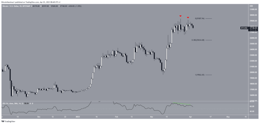 لم تنجح عملة بيتكوين BTC في الاختراق منذ 24 مارس، حيث خلق السعر ارتفاعاً قليلاً وفتيلًا علويًا طويلًا في 30 مارس.