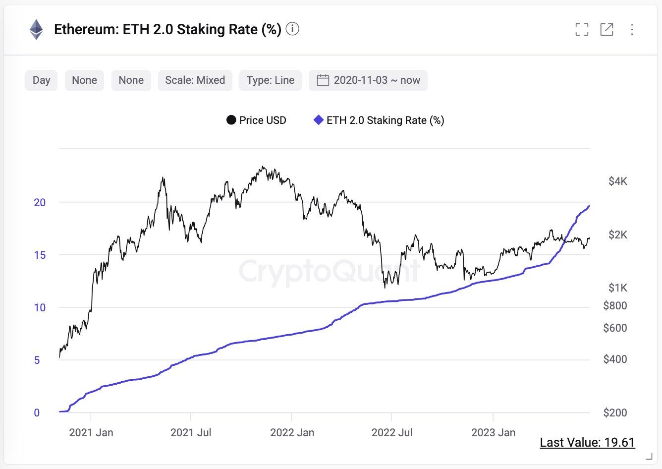 وتختلف الأرقام الخاصة بمبلغ الإيثر المربوط بناءً على منصة التحليلات المستخدمة. حيث تذكر CryptoQuant رقمًا يقترب من 20%، وهو ما يقل قليلاً عن 24 مليون إيثر.