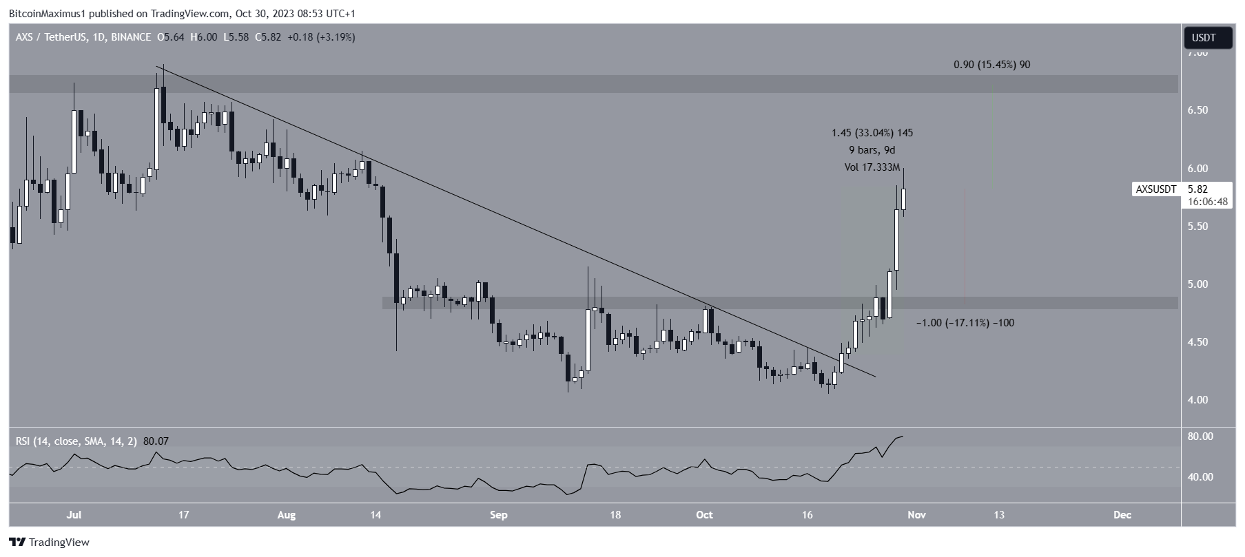 ارتفع سعر AXS بسرعة منذ خروجه من خط اتجاه المقاومة الهابط في 21 أكتوبر. وفي 9 أيام، ارتفع سعر AXS بنسبة 33%، وبلغ ذروته عند 6 دولارات اليوم.