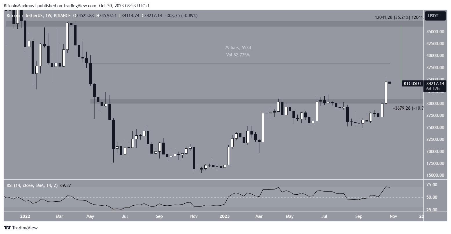 ارتفع سعر عملة البيتكوين بسرعة الأسبوع الماضي، ليصل إلى أعلى مستوى سنوي جديد عند 35,280 دولارًا. تسببت الزيادة في سعر البيتكوين في اختراق منطقة المقاومة البالغة 30500 دولار، والتي كانت قائمة منذ مايو 2022.