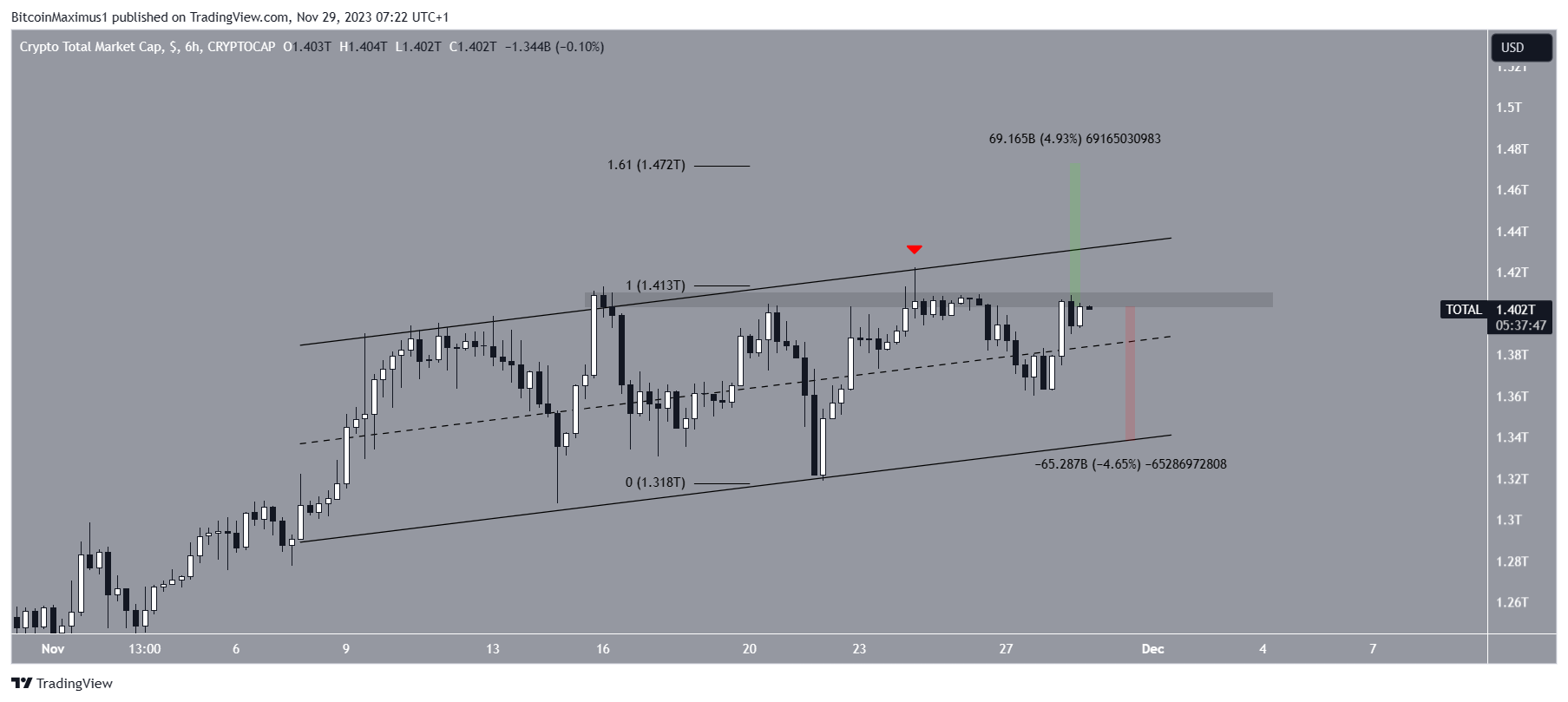 إذا اخترق TOTALCAP هذه المقاومة، فيمكن أن يرتفع بنسبة 5٪ ويصل إلى المقاومة التالية عند 1.47 تريليون دولار. يتم إنشاء المقاومة من خلال مستوى تصحيح فيبوناتشي الخارجي 1.61 للانخفاض السابق. وهذا من شأنه أن يشكل اختراقا للقناة.