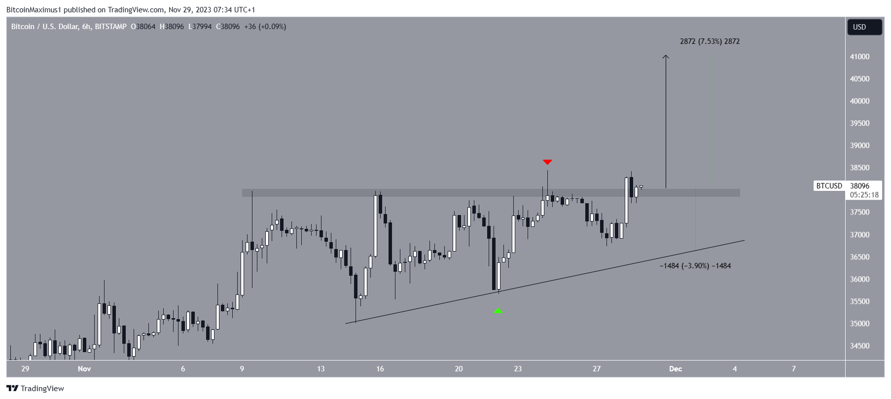 تم تداول سعر البيتكوين داخل نمط المثلث منذ 9 نوفمبر. وفي الآونة الأخيرة، ارتد عند خط اتجاه الدعم الصاعد لهذا المثلث في 22 نوفمبر (الرمز الأخضر)، ليبدأ الحركة الصعودية الحالية.