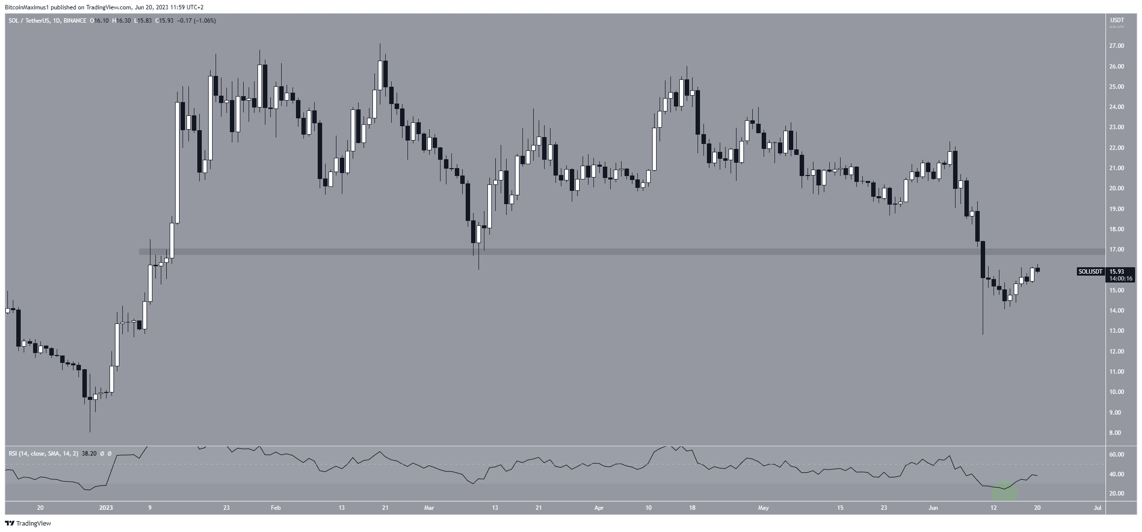 ويُظهر التحليل الفني للإطار الزمني اليومي لـ SOL أن السعر قد انخفض منذ 17 أبريل. حيث أسست عملة سولانا قمة منخفضة في 4 يونيو (الرمز الأحمر) قبل تسريع معدل الانخفاض. إلى أن أدى ذلك لانخفاض إلى أدنى مستوى عند 12.80 دولار في 10 يونيو.