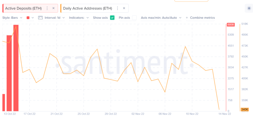 وأشارت بيانات السلسلة عبر منصة Santiment في الرابع عشر من نوفمبر إلى زيادة الودائع النشطة الخاصة بعملة الإيثر في وقت انخفاض عدد المتداولين يومياً على شبكة ايثريوم بما أدى إلى تراجع المتداولين.