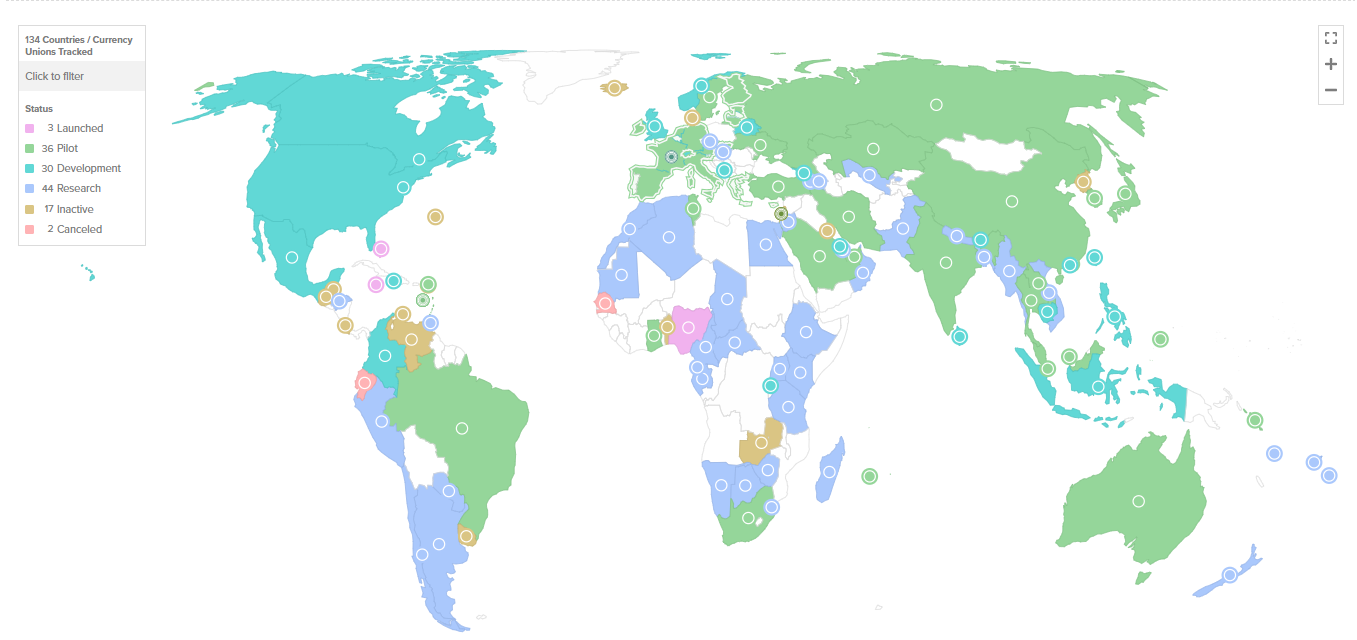 الجدير بالذكر أن الغالبية العظمى من الدول واتحادات العملة - 134 في المجموع، والتي تشكل 98٪ من الناتج المحلي الإجمالي العالمي- تفكر في تنفيذ العملة الرقمية للبنك المركزي. وهي زيادة كبيرة من 35 دولة تستكشفها في مايو 2020. أيضا، في الوقت الحاضر، تشارك 68 دولة بنشاط في مراحل متقدمة من استكشاف العملات الرقمية للبنك المركزي. بما في ذلك التطوير أو البرامج التجريبية أو الاستعدادات للإطلاق.