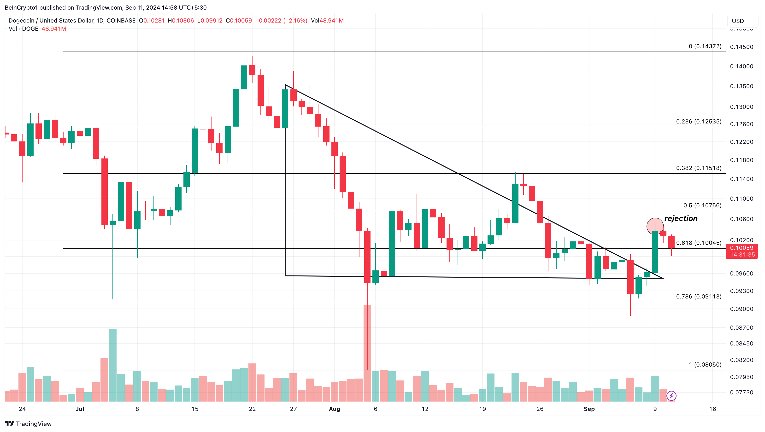 ومع ذلك، واجهت العملة رفضًا، حيث استهدفت 0,11 دولار. استنادًا إلى الصورة أدناه، سعر دوجكوين على شفا الانخفاض أدنى مستوى تصحيح فيبوناتشي 61,8%.