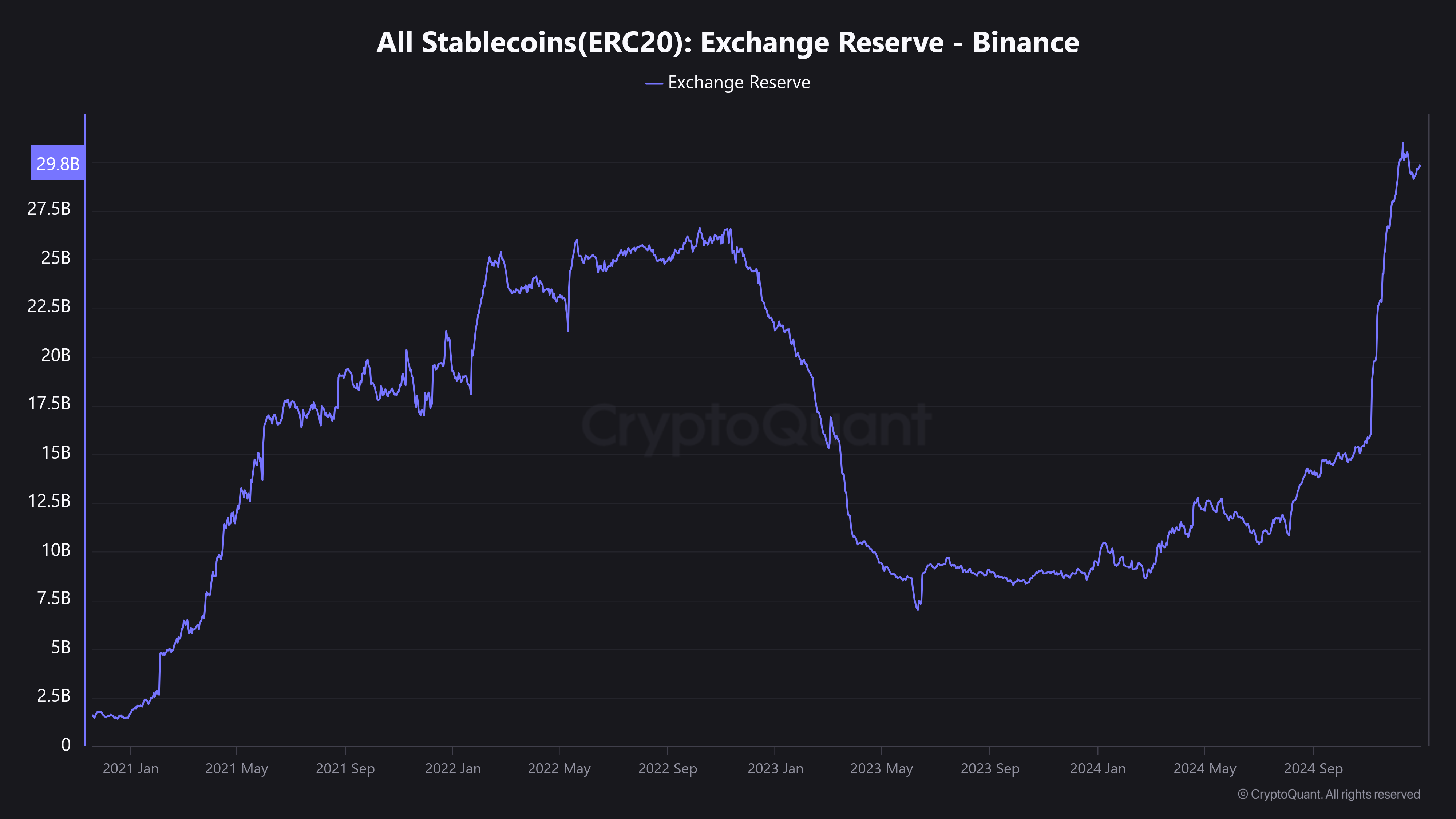 تظهر البيانات أن احتياطات العملات المستقرة من نوع ERC-20 على بينانس ارتفعت بشكل ملحوظ، لتصل إلى أعلى مستوى لها على الإطلاق. حيث تخطت 30 مليار دولار قبل أن تتراجع قليلا إلى حدود 29.8 مليار دولار حاليا. في حين أن المستوي القياسي السابق كان عند 26.4 مليار دولار الذي سُجّل في نوفمبر عام 2022.
