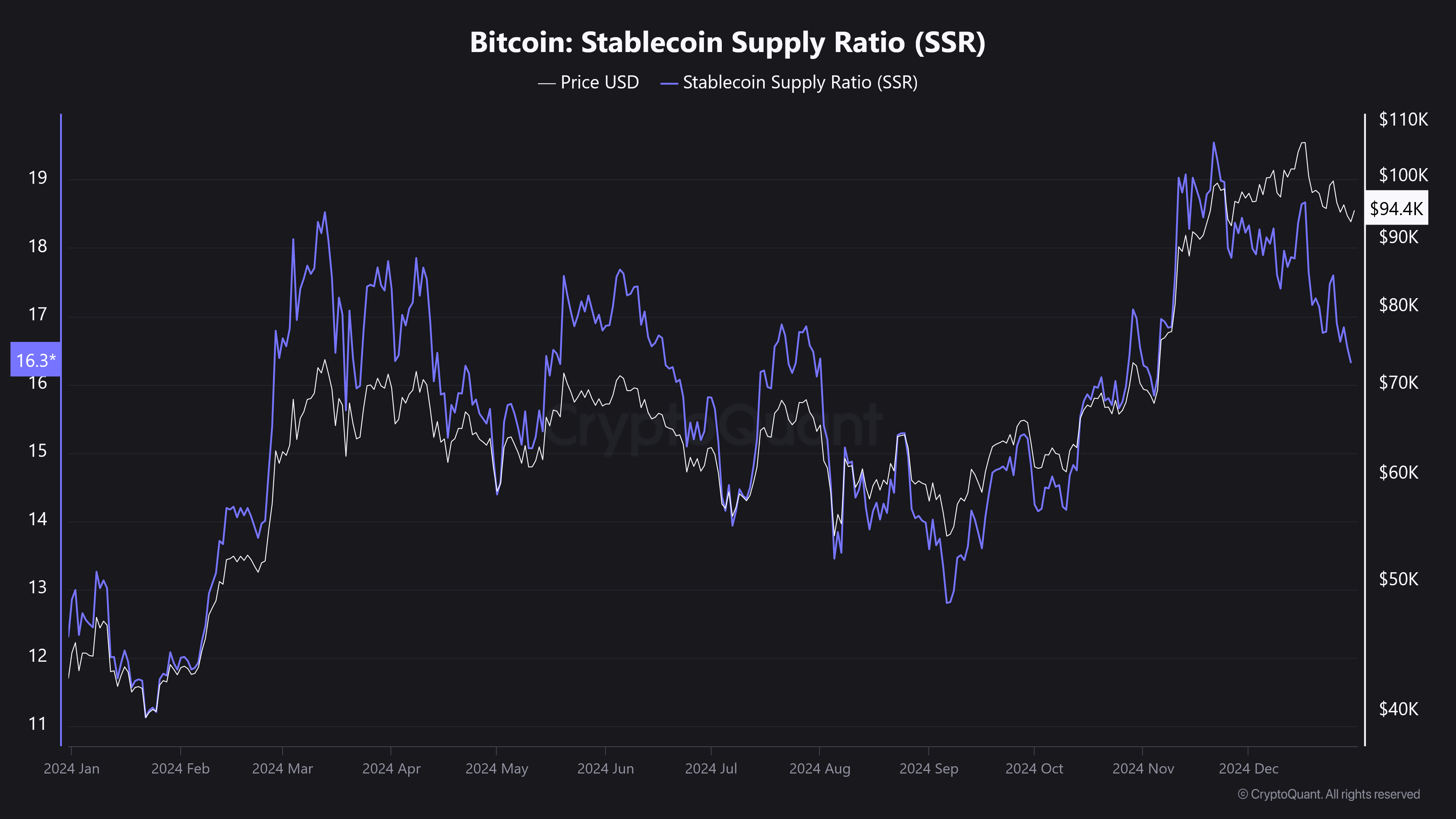 - في كثير من الأحيان، يراقب المحللون “نسبة المعروض من البيتكوين إلى حجم العملات المستقرة” (Stablecoin Supply Ratio - SSR). والتي قد تعطي لمحة سريعة عن مدى توافر السيولة مقابل عدد عملات البيتكوين المتداولة. إذا انخفضت هذه النسبة (أي ازدادت العملات المستقرة نسبيًا)، يُنظر لذلك على أنه إشارة صعودية محتملة، والعكس صحيح.
