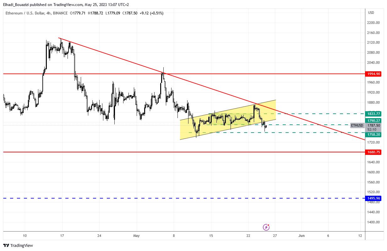 ولكن أعتقد أن احتمل حدوث ذلك في الوقت الراهن ضعيف. لأن السوق و معها عملة إيثيريوم في حالة ترقب لأوضاع الاقتصاد الكلي. و لذلك قد ستمر سعر ETH في التراوح بين خط الاتجاه الهابط و مستوى الدعم 1680 دولار.