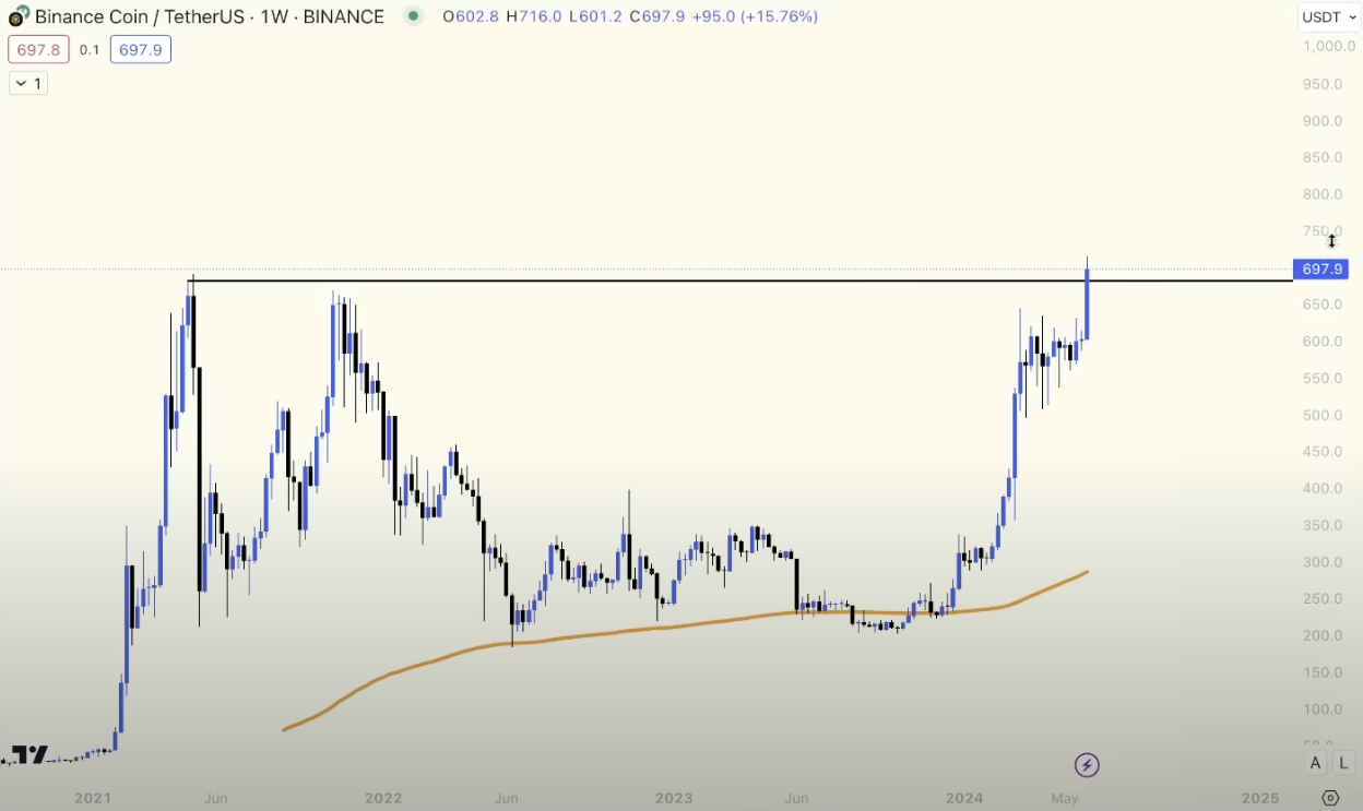 Binance Coin، الرمز الأصلي لنظام Binance البيئي ، هو عملة بديلة أخرى يعتقد Deutscher أن لديها إمكانات قوية. أظهر BNB مرونة ، حيث حقق ارتفاعات جديدة على الإطلاق وكسر المستويات الرئيسية على الرسم البياني الأسبوعي. اقترح دويتشر أن القيمة السوقية المرتفعة لـ BNB قد لا تؤدي إلى مكاسب هائلة ولكنها لا تزال تمثل تجارة قوية.