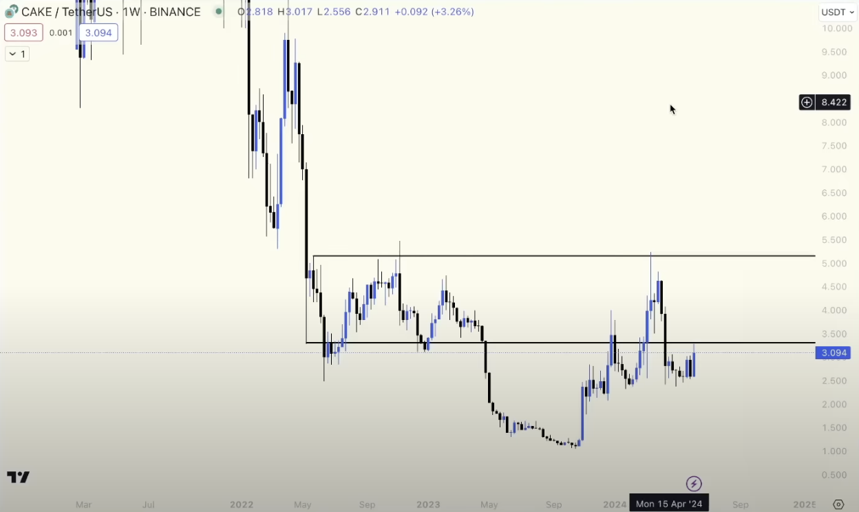 رمز CAKE الخاص بـ PancakeSwap هو عملة بديلة أخرى يراقبها Deutscher عن كثب. وأشار إلى أن CAKE بدأت في استعادة مستويات الدعم الرئيسية واختراق المتوسطات المتحركة الكبيرة. مع نمو قطاع DeFi، أصبحت منصات مثل PancakeSwap ذات أهمية متزايدة.