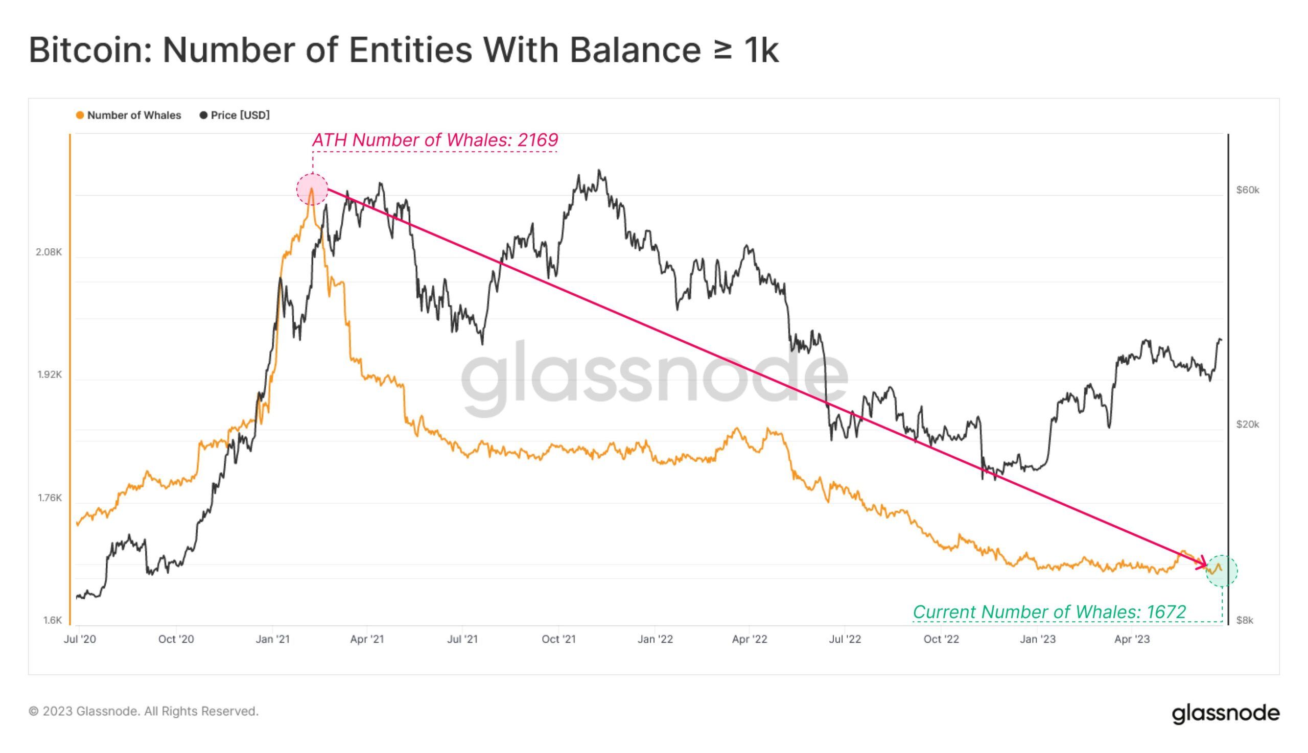 وفي 26 يونيو، أفاد مزود التحليلات على السلسلة Glassnode أن عدد حيتان البتكوين قد شهد انخفاضًا.