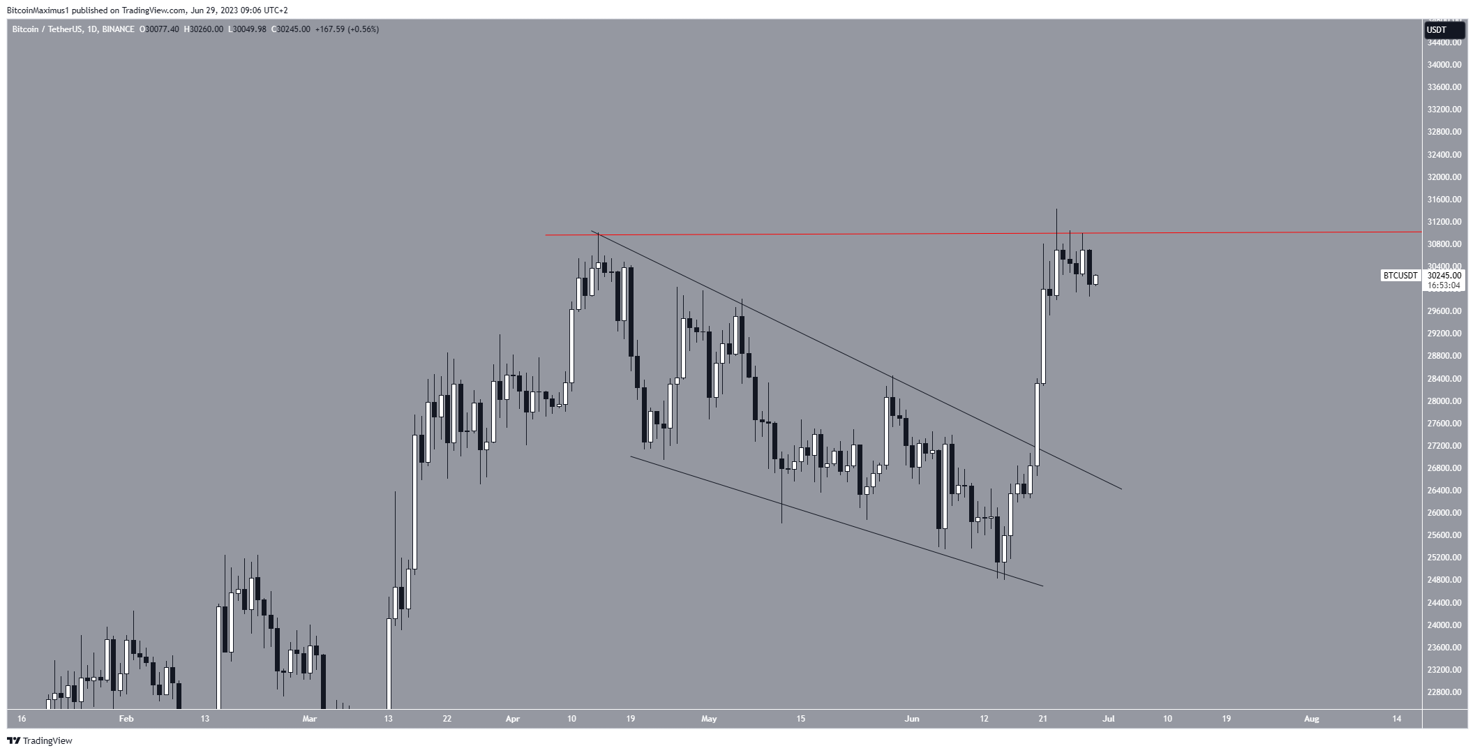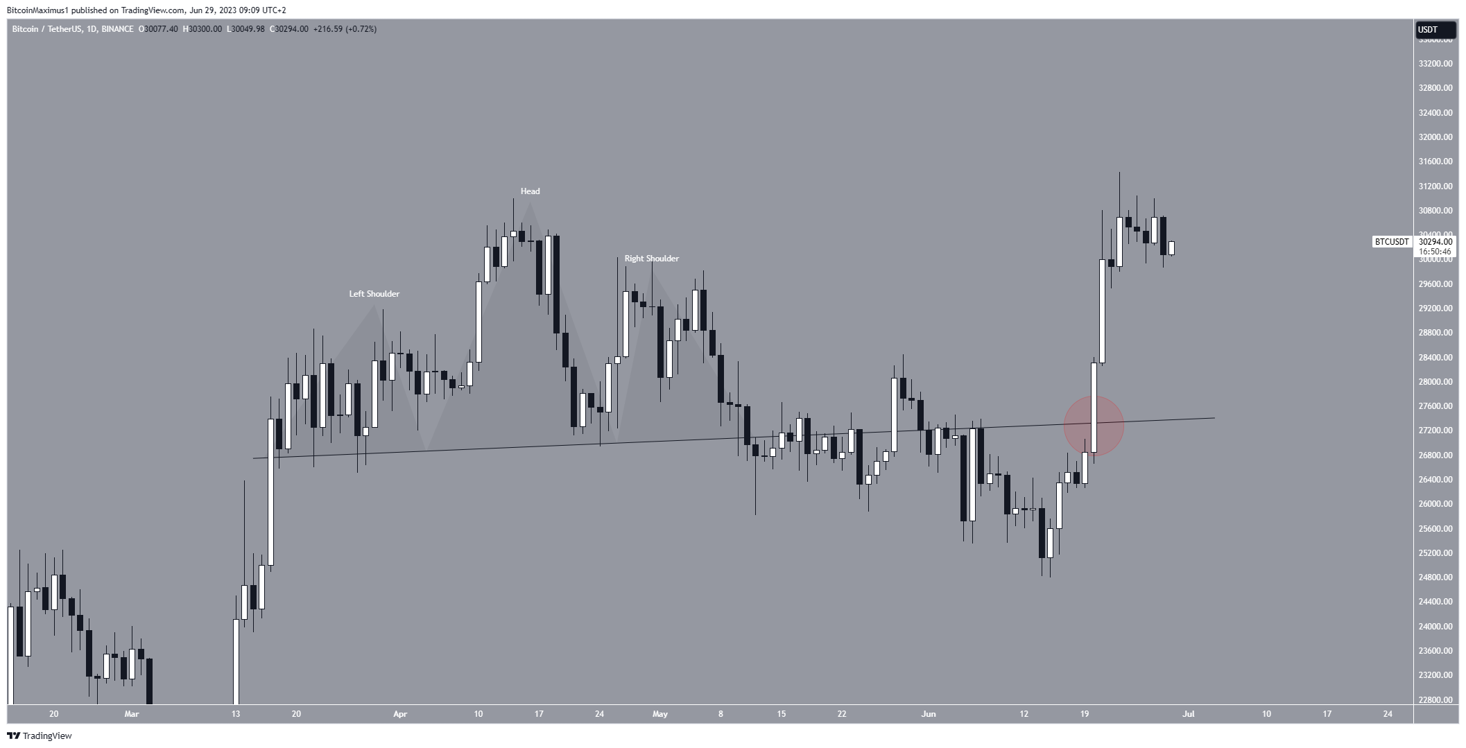 ومع ذلك، اخترق سعر البتكوين خط العنق دون أن يتفاعل معه على الإطلاق (الدائرة الحمراء)، ليصل إلى أعلى مستوى سنوي جديد في 23 يونيو.