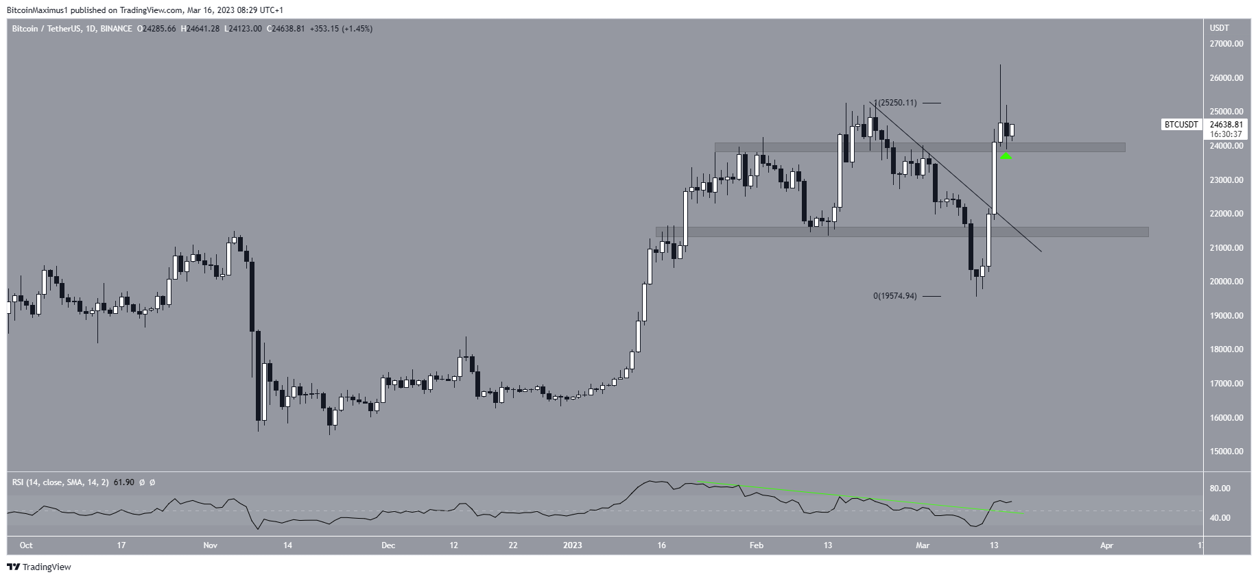 وعاد السعر ليتحقق من صحة منطقة 24000 دولار كدعم (أيقونة خضراء).