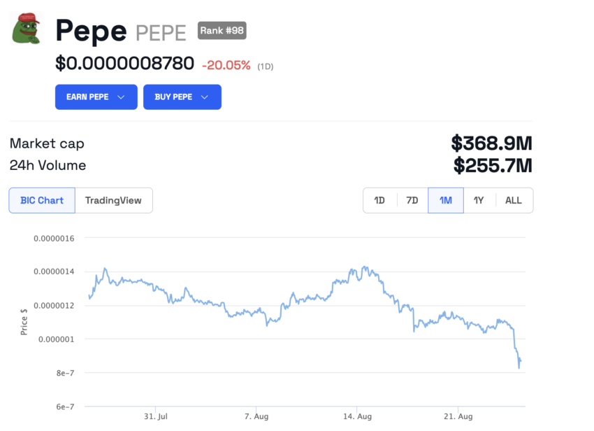 من ناحية أخرى، انخفض سعر عملة PEPE بأكثر من 20% خلال الـ 24 ساعة الماضية. حيث يؤدي حجم التداول المتزايد إلى دفع التخمينات بأن المستثمرين يبيعون بخوف ومع ذلك، فلا توجد مشاركة أو تفسير ملموس في هذه المرحلة.