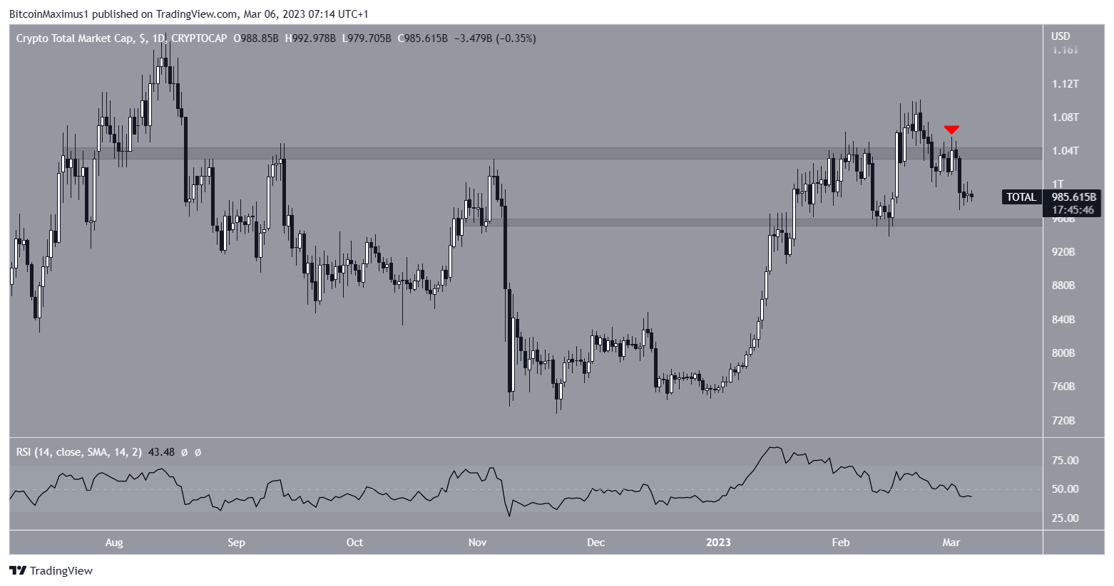 وقد تم رفض القيمة السوقية للعملات الرقمية من قبل منطقة المقاومة الواصلة إلى 1.04 تريليون دولار في الأول من مارس.