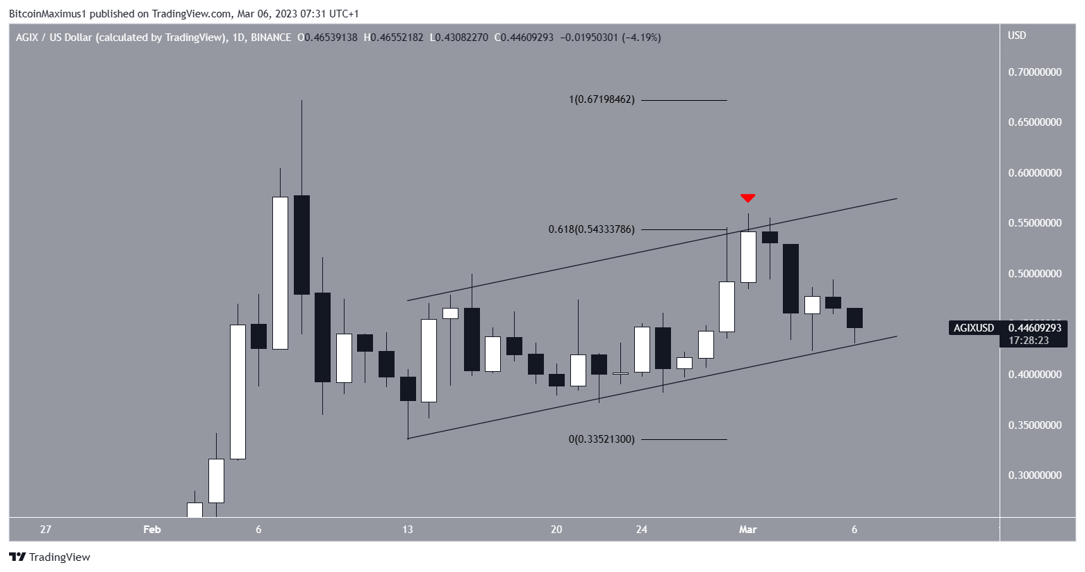 ومع الانهيار فقد ينخفض سعر AGIX إلى 0.30 دولار، وإذا اخترق السعر القناة فقد يتبع ذلك ارتفاع إلى 0.70 دولار.